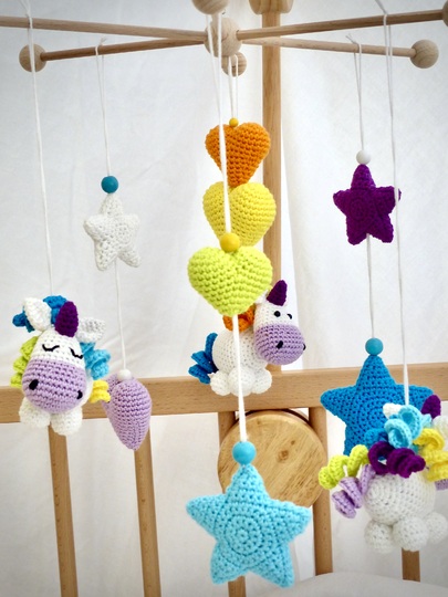 In den zarten Farben des Regenbogens schweben die kleinen Einhörner mit Herzen und Sternen über dem Babybett oder dem Wickeltisch ♥ ♥ ♥