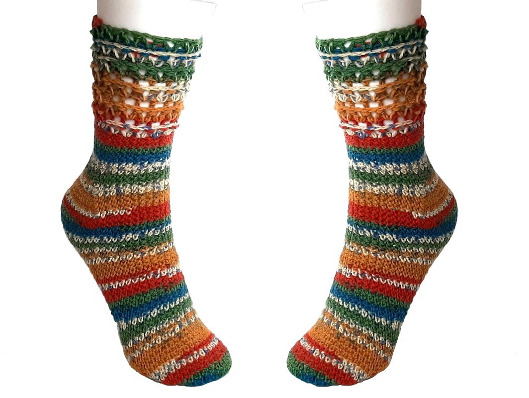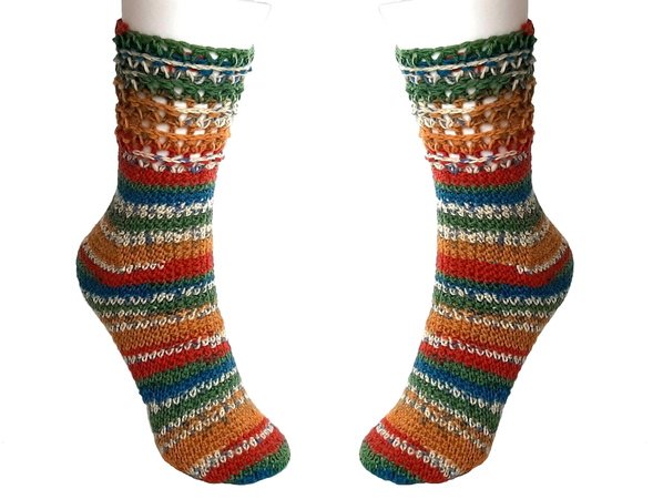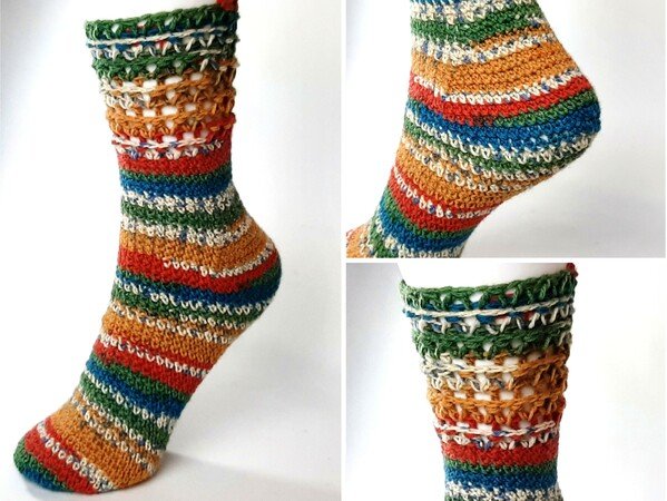 Die Häkelsocke Fixe-Ferse „Buntspecht“ ist sehr schnell gehäkelt und hat einen perfekten Sitz. Durch die besonderen erweiterten festen Maschen sitzt sie nicht so steif wie man es von Häkelsocken gewohnt ist, sondern sie schmiegt sich schön dem Fuß an und lässt sich dehnen. Auch ist sie nicht so dick wie andere Häkelsocken.