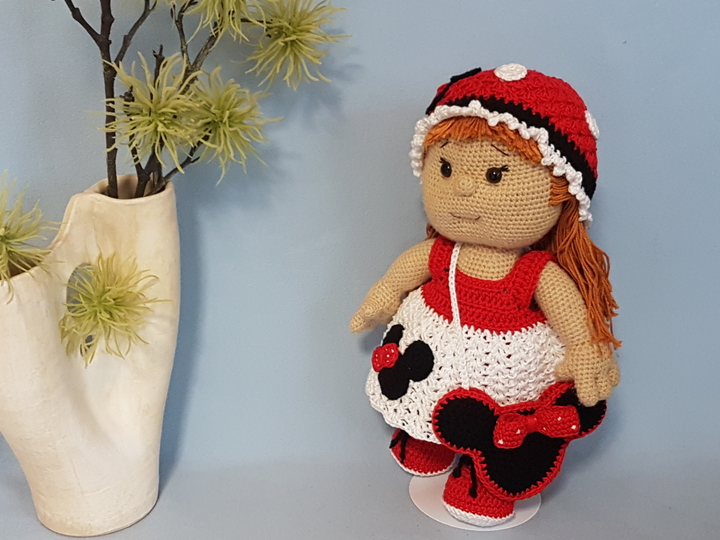 Die PDF beinhaltet die Anleitung für die Puppe, das Kleid, die Schuhe, das Höschen, die Mütze, sowie für die Mäuschentasche