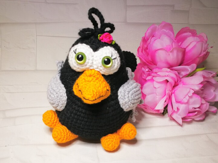• Garn: ca. 2x50 g in deiner Hauptfarbe (hier schwarz), ca. 1x50 g in Kontrastfarbe 1 für die Füße und den Schnabel (hier orange), 1x50 g in Kontrastfarbe 2 für die Flügel (hier grau).