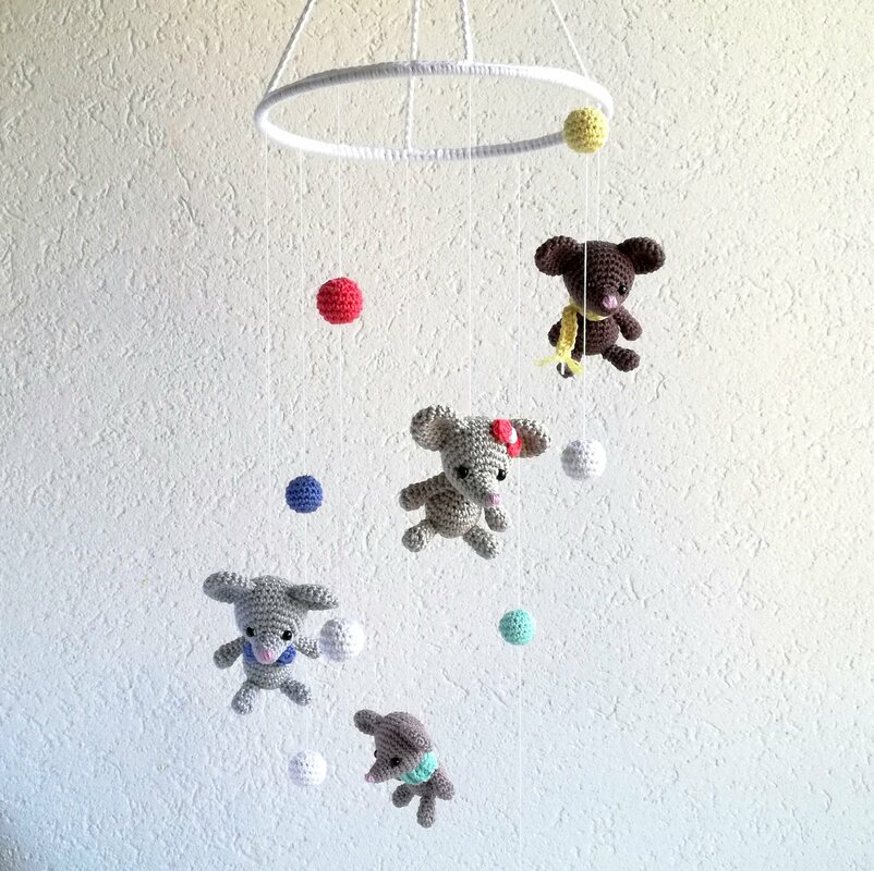Ein gehäkeltes Mobile mit Mäuschen mit vier verschiedenen Accessoires und Kugeln, ist das perfekte Geburtsgeschenk um die Einrichtung im Babyzimmer abzurunden. Häkle jetzt das hübsche Mäuschenmobile und punkte mit der tollen Geschenkidee!