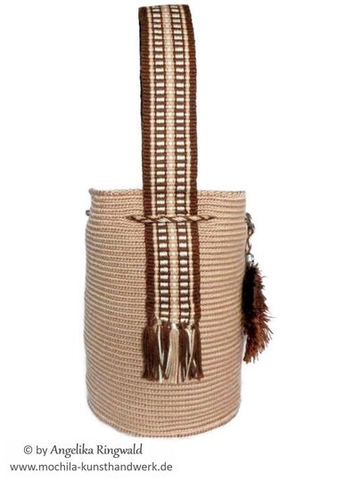 Diese wunderschöne Mini-Mochila ist nicht einfach eine „Häkeltasche“ oder ein „Häkelbeutel“. Sie wird in der originalen Wayuu-Technik gehäkelt und ist so stabil, dass sie von alleine aufrecht stehen bleibt. Sie ist als Shopping-Begleiter gedacht, denn sie bietet genau Platz für den Geldbeutel, das Handy, den Autoschlüssel – und die Brille, falls nötige. Sie kann aber ebenso als Leckerli-Beutel beim Hundespaziergang eingesetzt werden. Der übliche Schultergurt wurde hier durch einen kurzen Handgurt ersetzt, so dass die Mini-Mochila z.B. auch perfekt am Handgriff eines Rollators mitgeführt werden kann, ohne in die Räder zu geraten. Man wird Sie um diese schnuckelige Mochila beneiden!