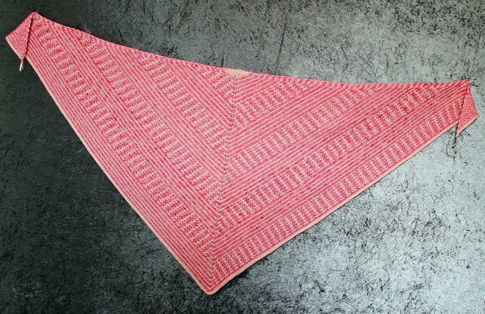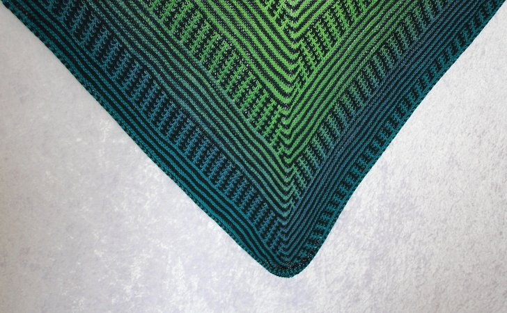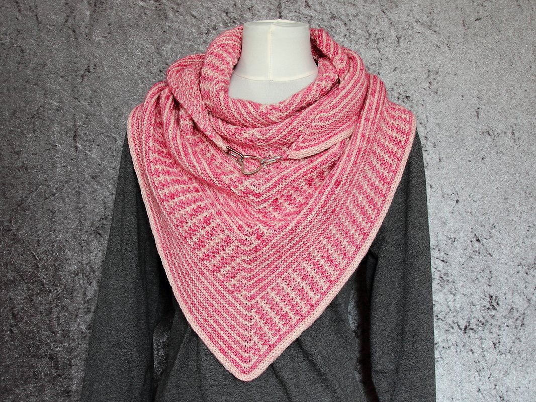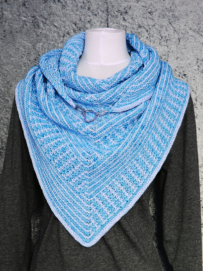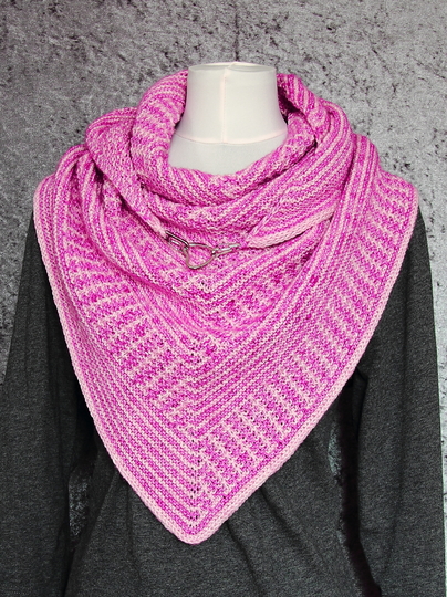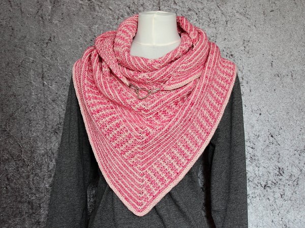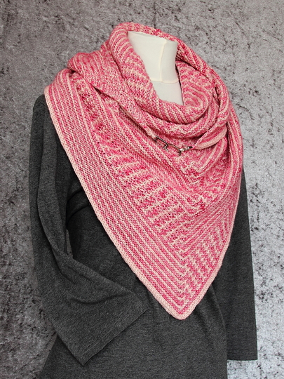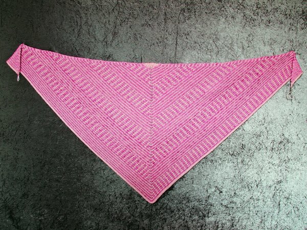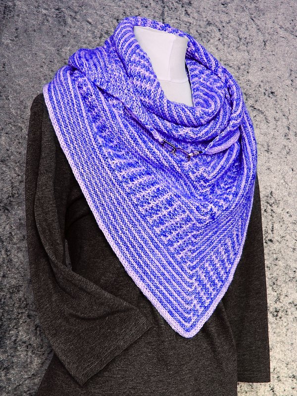 Das klassische Dreieckstuch wird dabei nur mit rechten Maschen gestrickt. Das effektvolle Muster ergibt sich dabei aus Hebemaschen, die sich mit rechts gestrickten Reihen abwechseln.