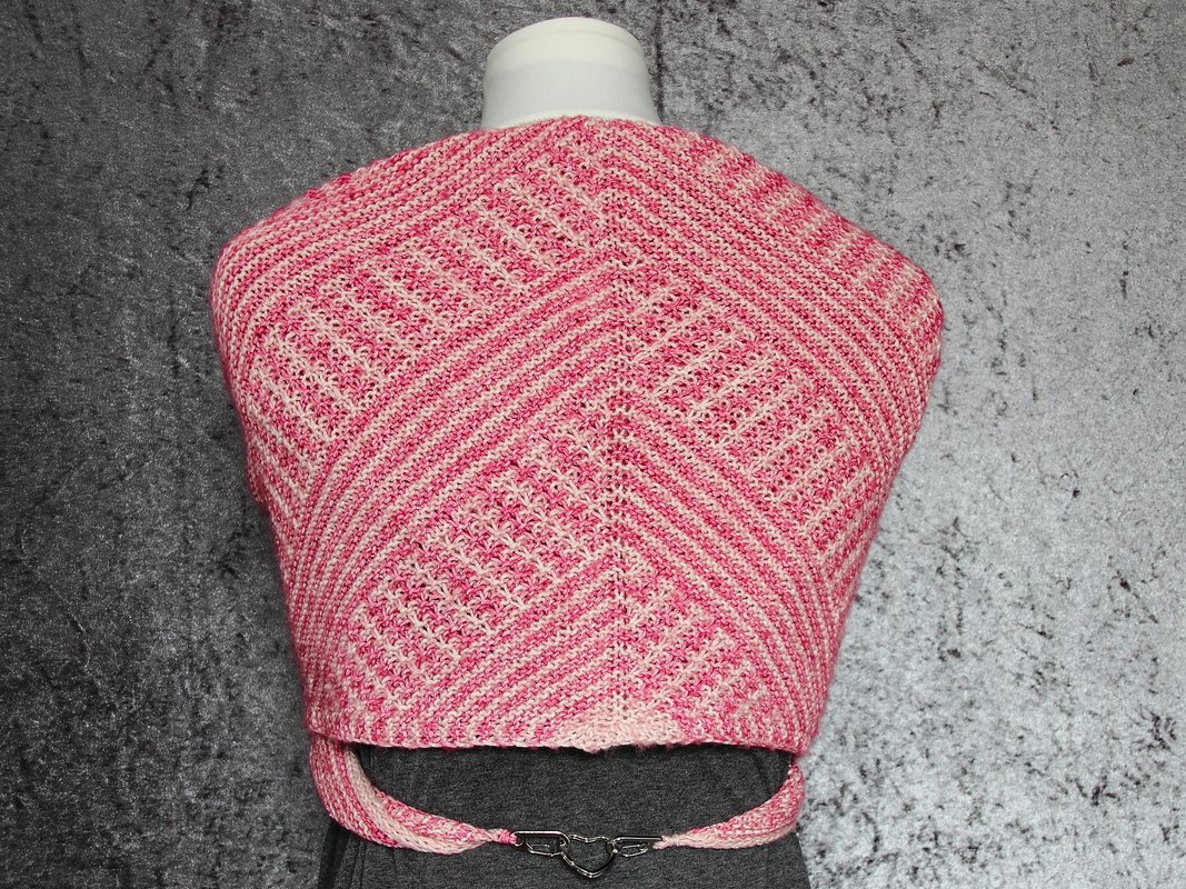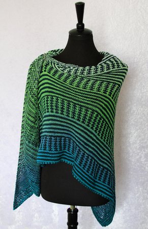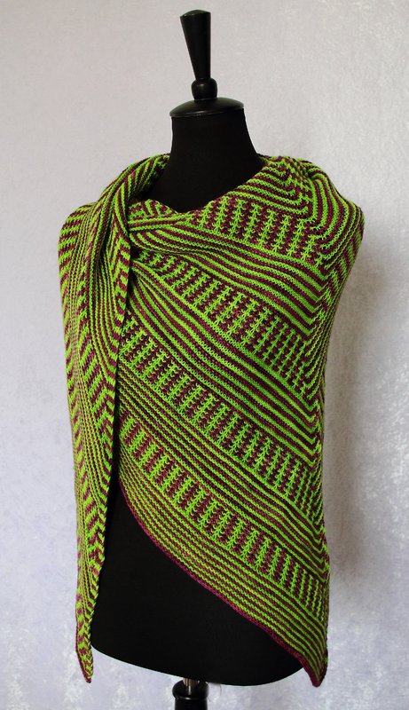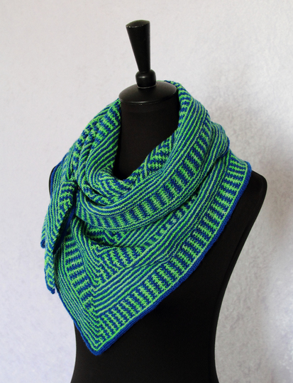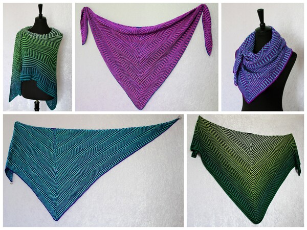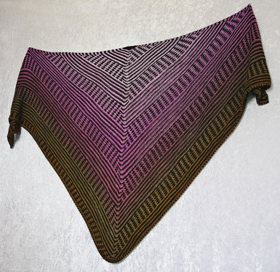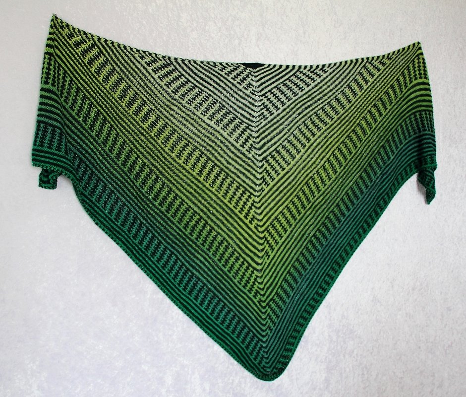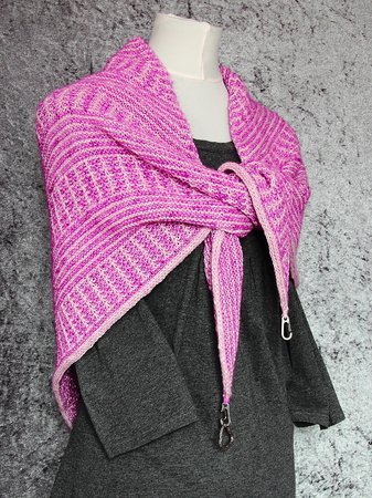 Das klassische Dreieckstuch wird dabei nur mit rechten Maschen gestrickt. Das effektvolle Muster ergibt sich dabei aus Hebemaschen, die sich mit rechts gestrickten Reihen abwechseln.