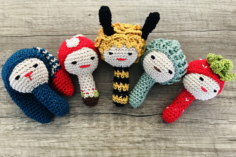 Mit dieser Anleitung kannst du 5 unterschiedliche Babyrasseln häkeln.