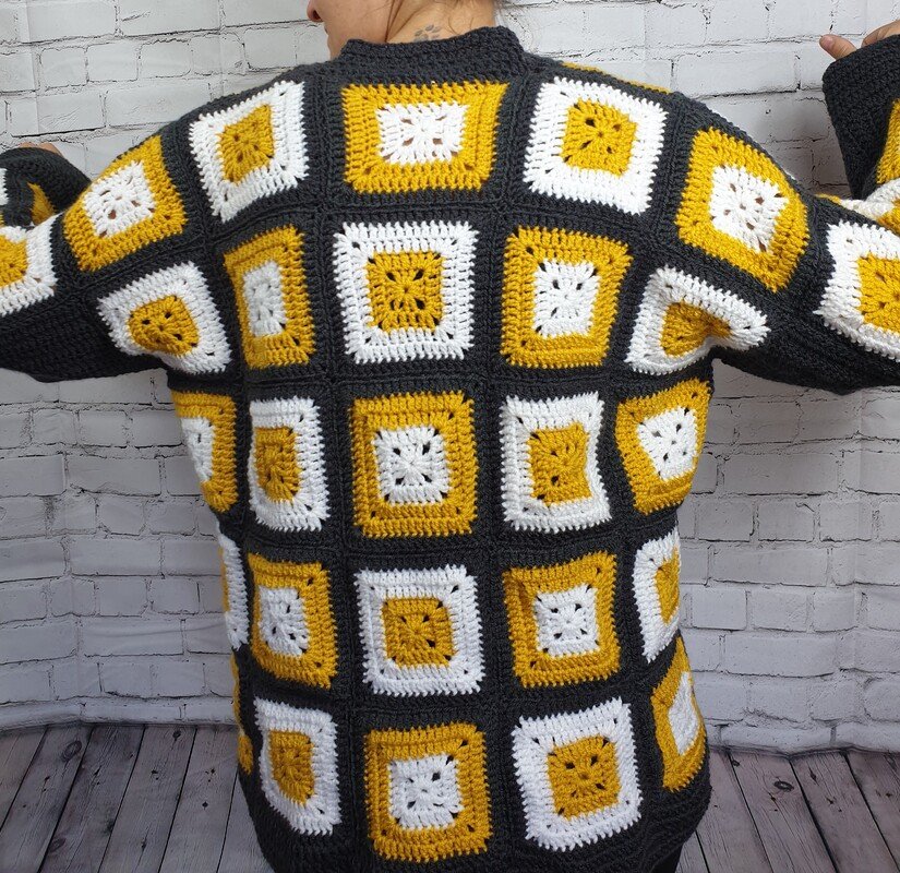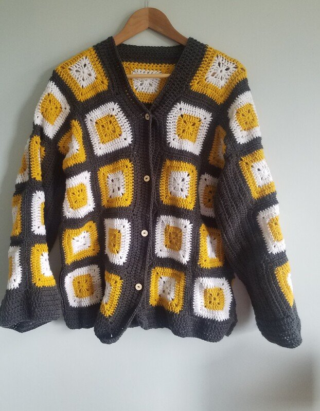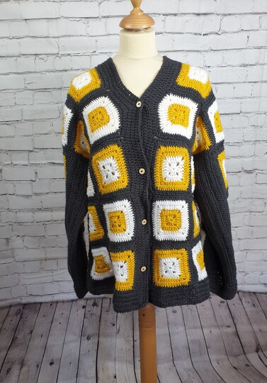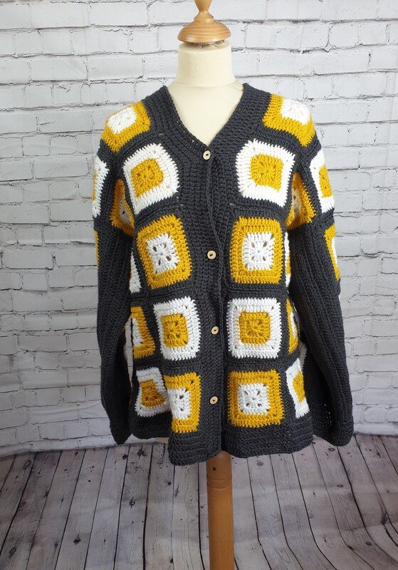 Dies ist eine Häkelanleitung für einen one size Cardigan aus einzelnen Granny Squares gehäkelt und zusammengenäht.