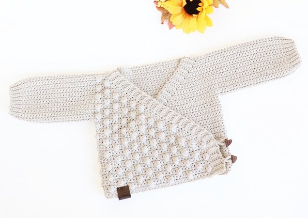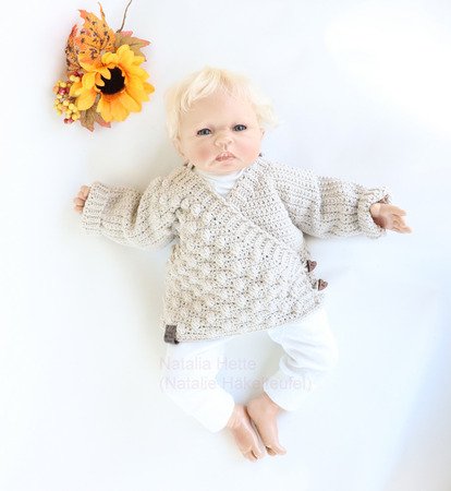 Häkelanleitung für eine einfache Babyjacke mit einer Überlappung vorne, die man sehr schnell und einfach hinbekommt. Die Wickeljacke wird als ein Teil gehäkelt und hat daher nur zwei Nähte.