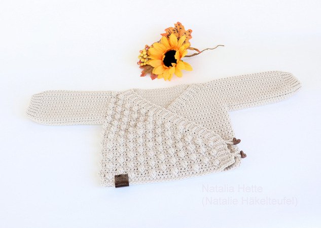 Vorteile einer Wickeljacke: 1. leicht anzuziehen; 2. hat nur zwei Nähte; 3. schnell und leicht zu häkeln; 4. kuschelig weich und angenehm für die Haut.