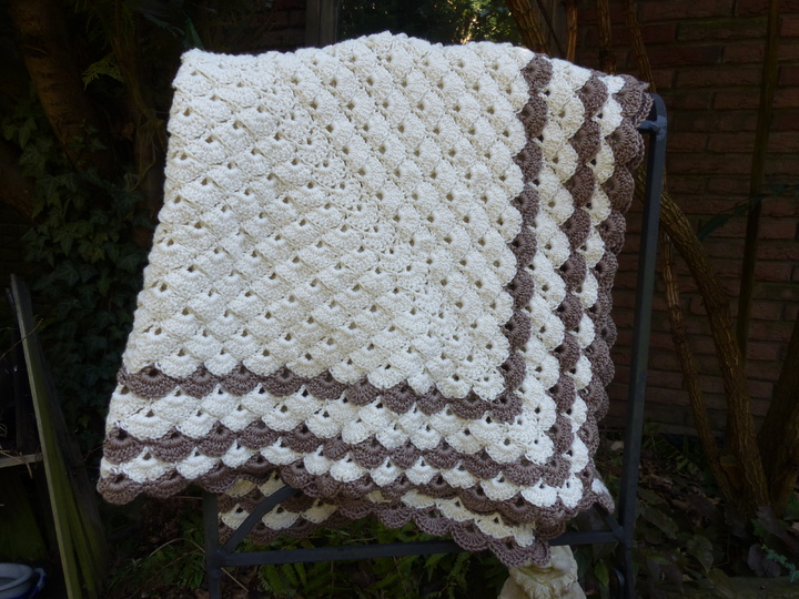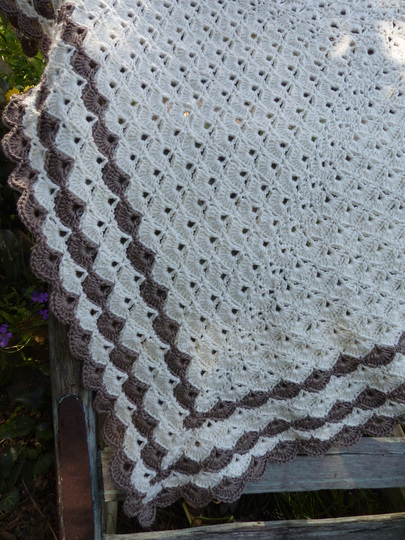 Für eine Größe von 76 cm x 76 cm habe ich 300 Gramm in Beige und 150 Gramm im Braun verhäkelt.