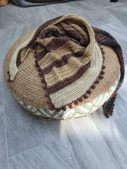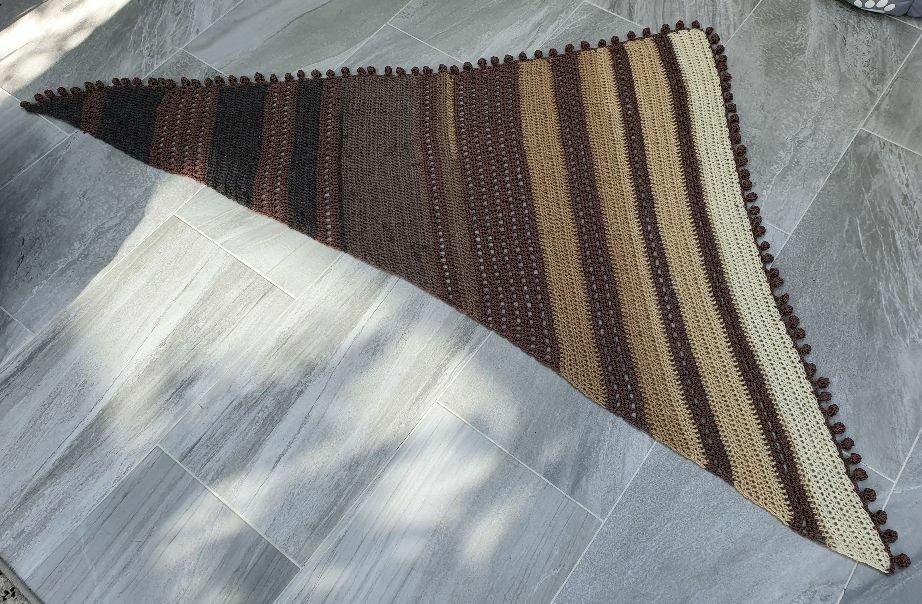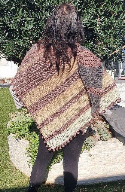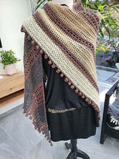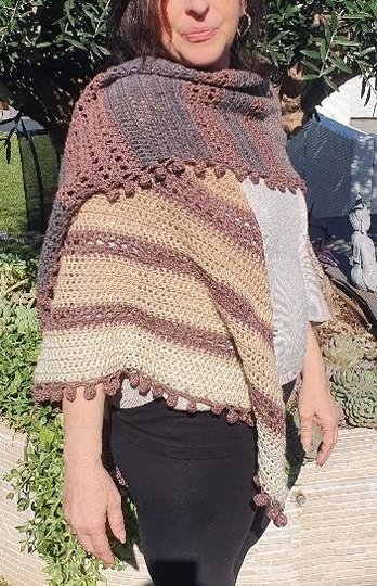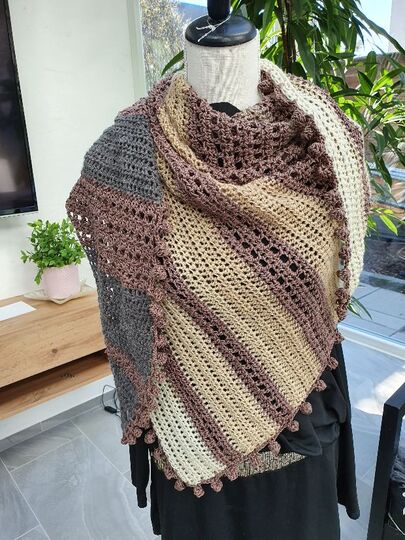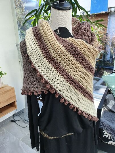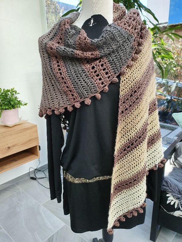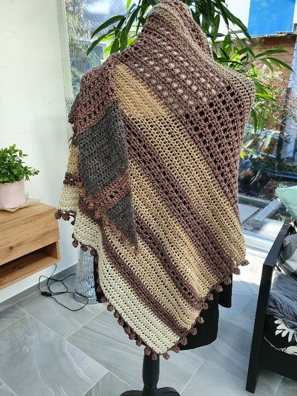 Der Wrap bzw. das Tuch wird von einer Seite zur anderen gehäkelt, es wird dadurch asymmetrisch.