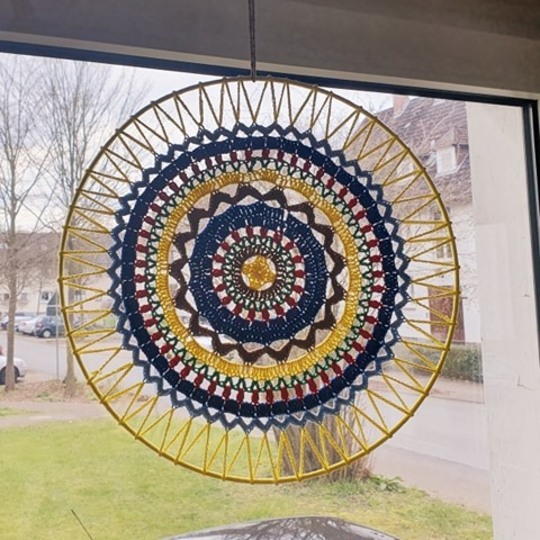Er ist 40 cm im Durchmesser und sieht wunderschön am Fenster aus, aber er sieht natürlich auch toll an Wand oder Tür aus.