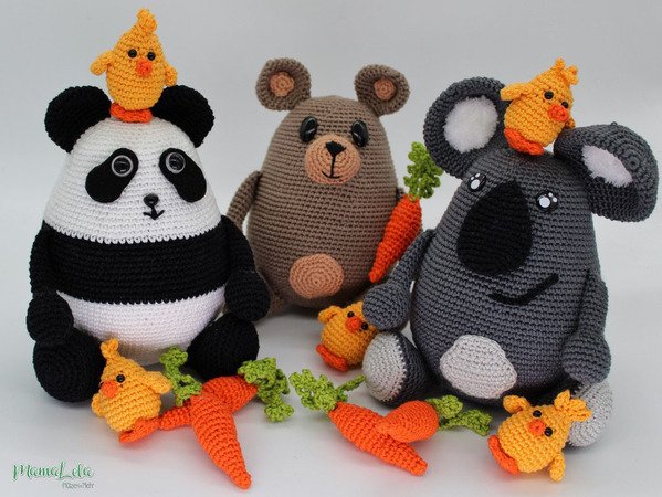 Mit dieser Häkelanleitung könnt ihr euch das im Artikelbild gezeigte Bärentrio samt der Spielwiese und Spielfiguren häkeln.