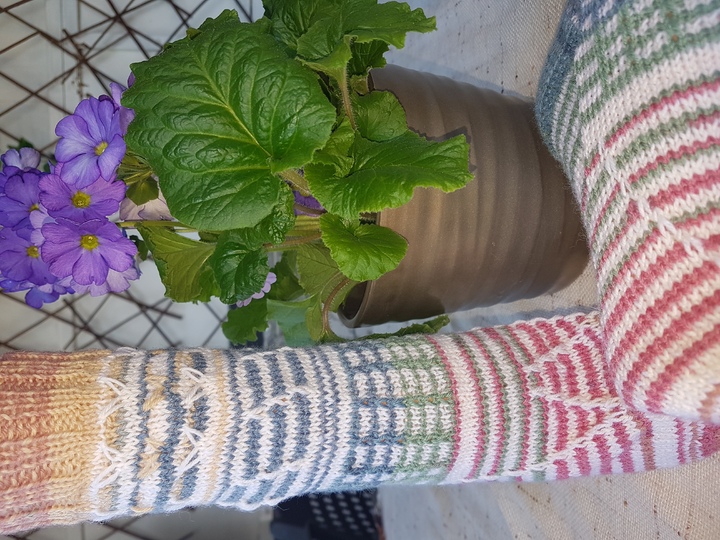 Sockenmuster mit verschieden Farben. Es wird immer nur mit einem Faden gestrickt. Zum Nacharbeiten dieser Socken können auch sehr gut Reste verwendet werden.