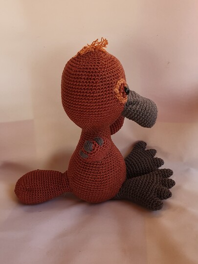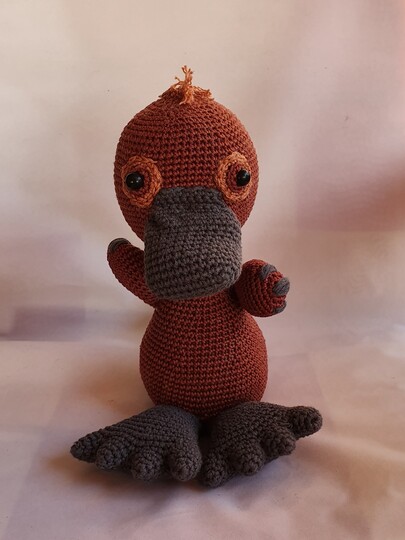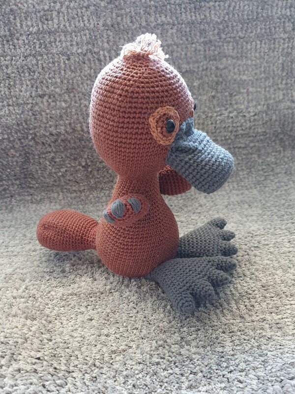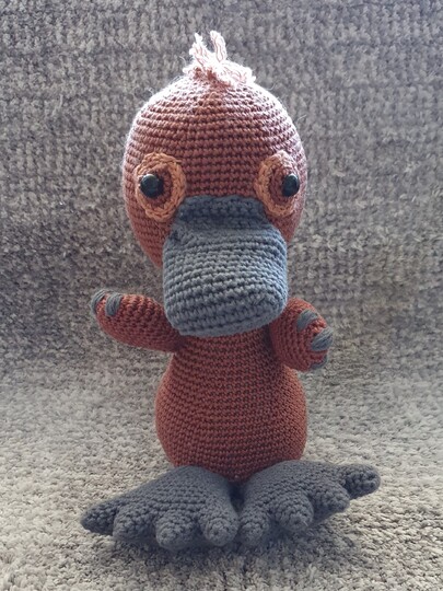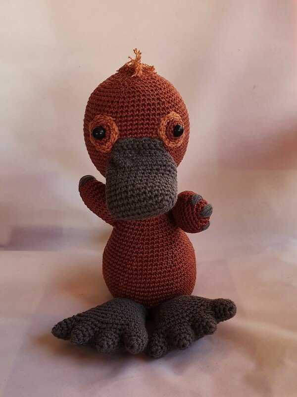 Mit der in der Anleitung angegebenen Nadelgröße und Wolle wird das Schnabeltier ca. 22 cm hoch.