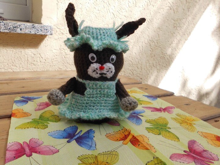 Mit Hut ist die Häsin ca. 13cm hoch, Herr Hase 12cm.