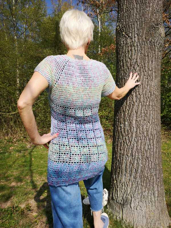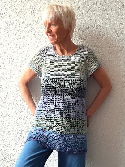 Ihr könnt das Shirt leicht an Eure Größe anpassen. Ich habe in der Anleitung die Angaben für Größe XS-XXXL angegeben. Mein Oberteil habe ich in Größe S/M gehäkelt. Mit der Raglan-von-oben Technik sind alle Größen möglich.