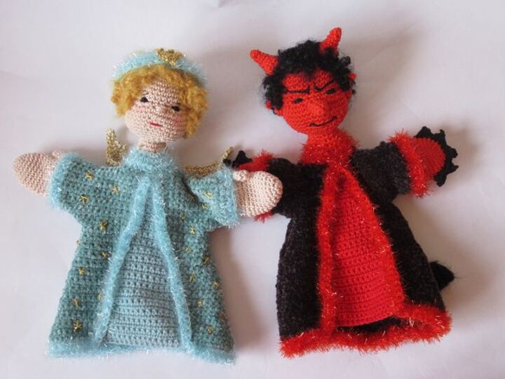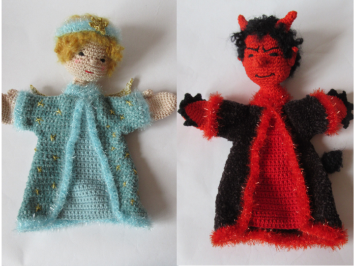 Der Engel steht auf der Seite der Guten. Er beschützt sie und möchte sie vor allem Bösen bewahren.Der Teufel ist immer zu Streichen aufgelegt und möchte die Guten immer wieder zum Bösen verführen. Aber gar so furchterregend und böse ist er dann doch nicht und lässt sich oft vom Engel bekehren.