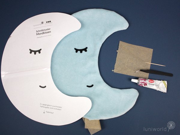 Du erhältst eine Anleitung sowie ein Schnittmuster zum Nähen des abgebildeten Mondkissens. Du solltest mit einer Nähmaschine umgehen können, wissen, wie man Applikationsvlies anwendet und wie der Matratzenstich funktioniert. :)