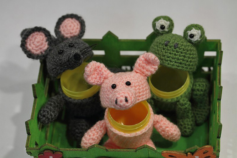 Üs lassen sich öffnen und als kleine Box verwenden. Sie bestehen aus umhäkelten Ü-Eiern (die normalen Ü-Eier).