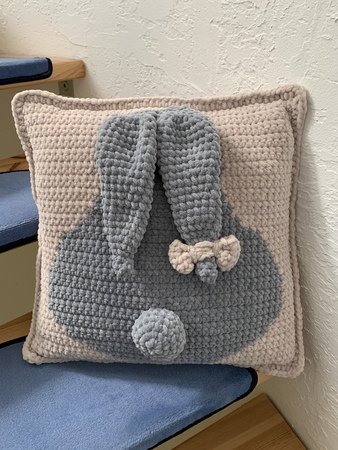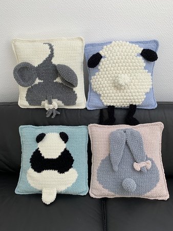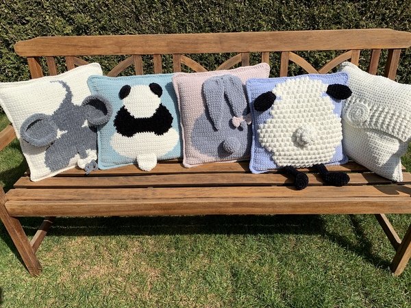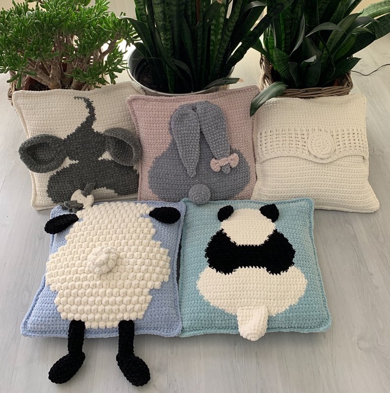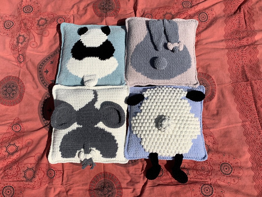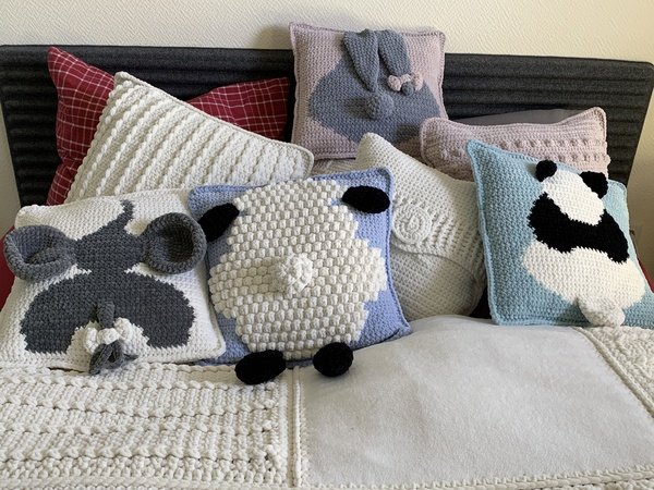 Du bekommst die Häkel-Anleitung für vier verschiedene Kissenplatten und zusätzlich die Rückseite, die du für alle Kissenplatten verwenden kannst. Du bekommst die Anleitung für ein Schaf, einen Pandabären, einen Elefanten und ein Häslein.