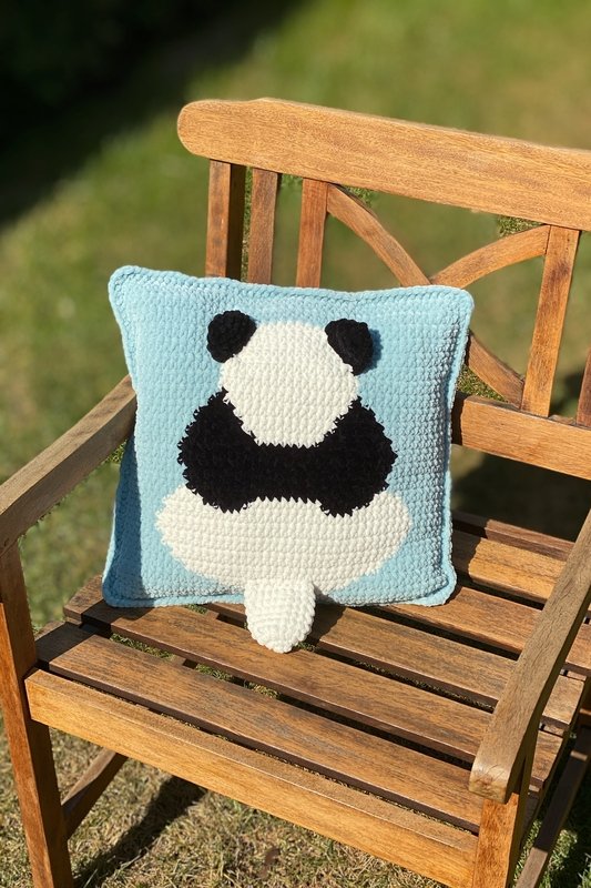 Du bekommst die Häkel-Anleitung für die Kissenplatte Pandabär und die Rückseite.