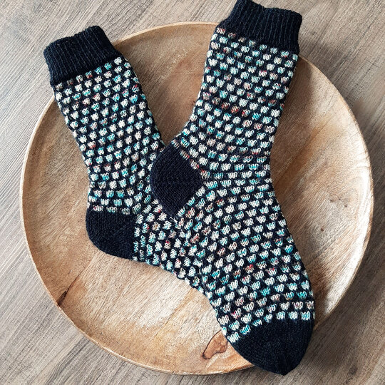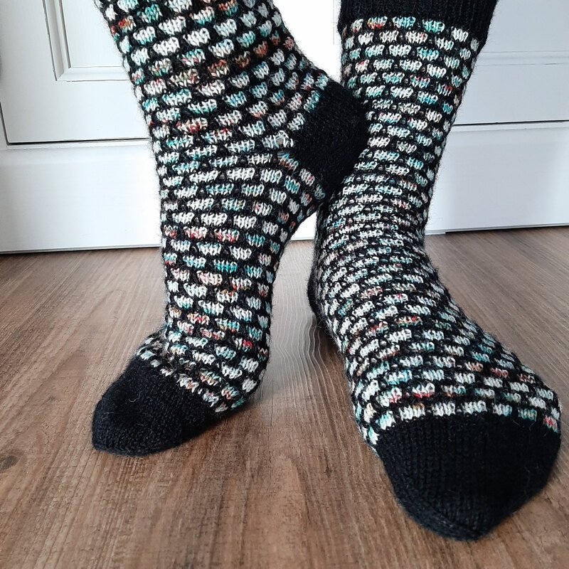Die Anleitung „Kachelsocken“ ist eine Sockenmusteranleitung mit einem Kachelmuster. Das Muster entsteht durch ein Hebemuster über mehrere Reihen. Ich empfehle hier zwei unifarbene Garne mit gutem Kontrast oder ein unifarbenes Garn mit einem Mustergarn zu kombinieren. So kommen die Kacheln (oder Rechtecke) besonders gut heraus.