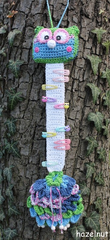 Eule Henriette hilft dabei, Ordnung ins Chaos zu bringen: die Haarspangen werden an Henriettes Hals befestigt und die Zopfgummis werden in ihrem Bauch verstaut. Der Bauch ist wie ein kleiner Beutel gestaltet, den man zuschnüren kann.