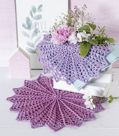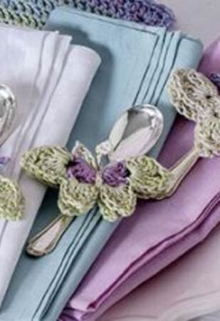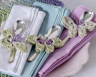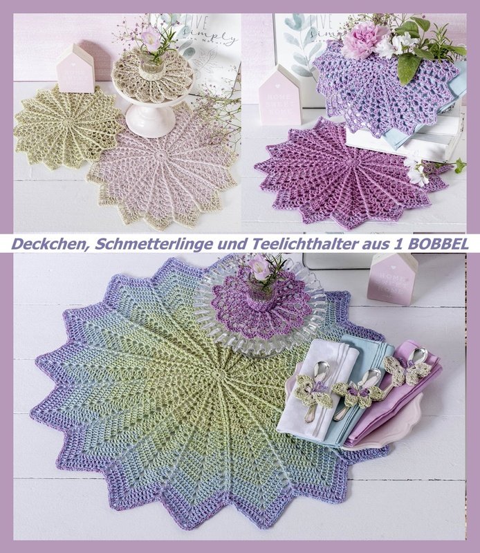 Aus 1 BOBBEL werden 5 Deckchen, Teelichthalter und Schmetterlinge gehäkelt. Einzelanleitung aus FL 2/2020
