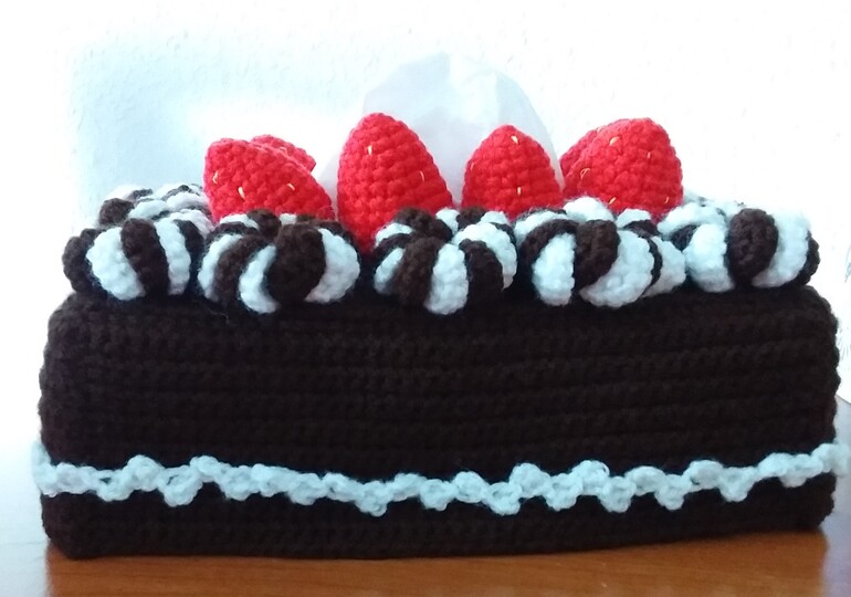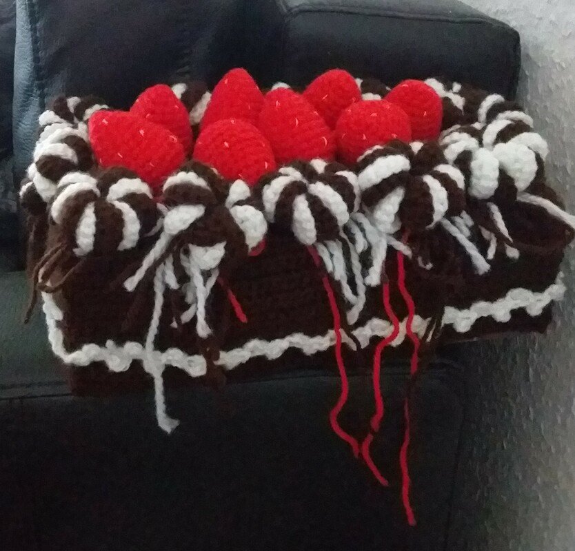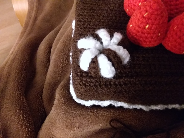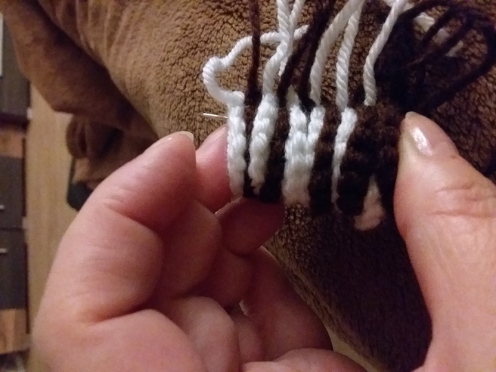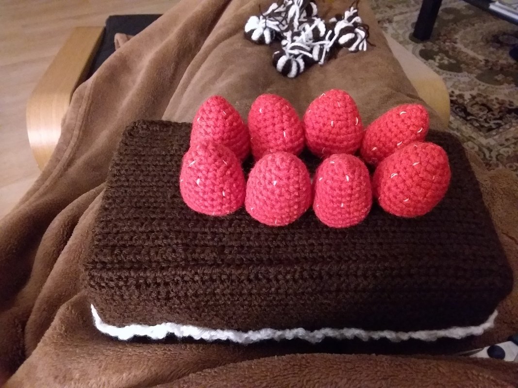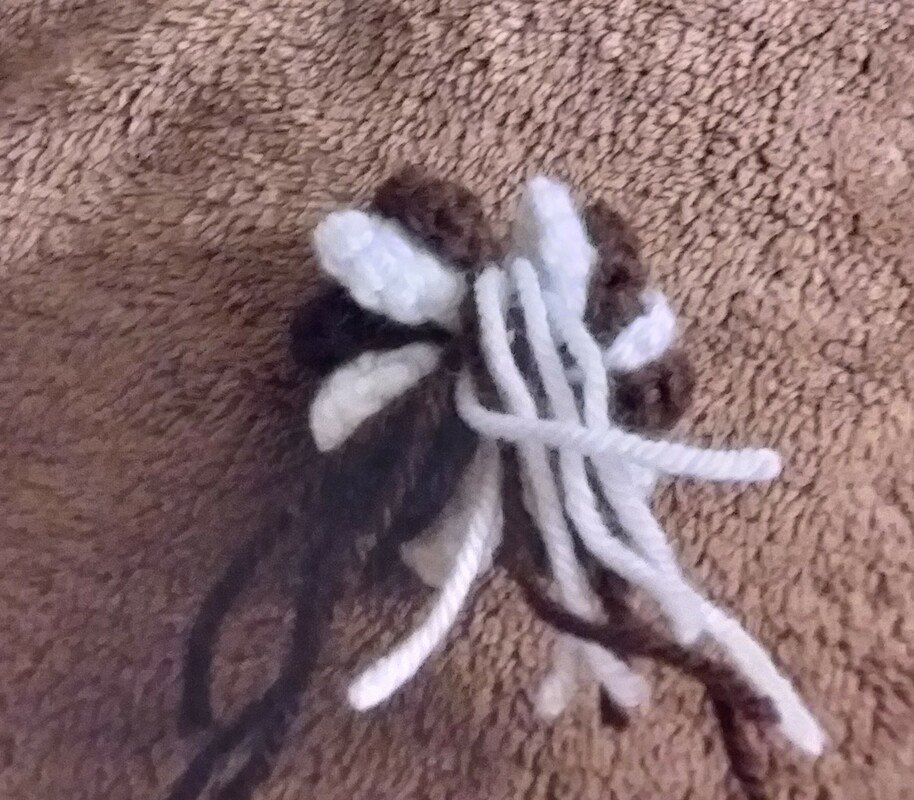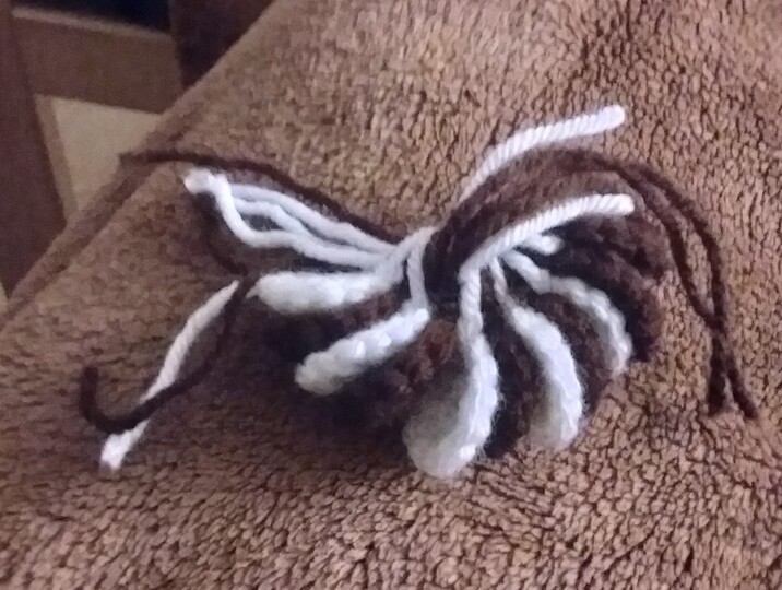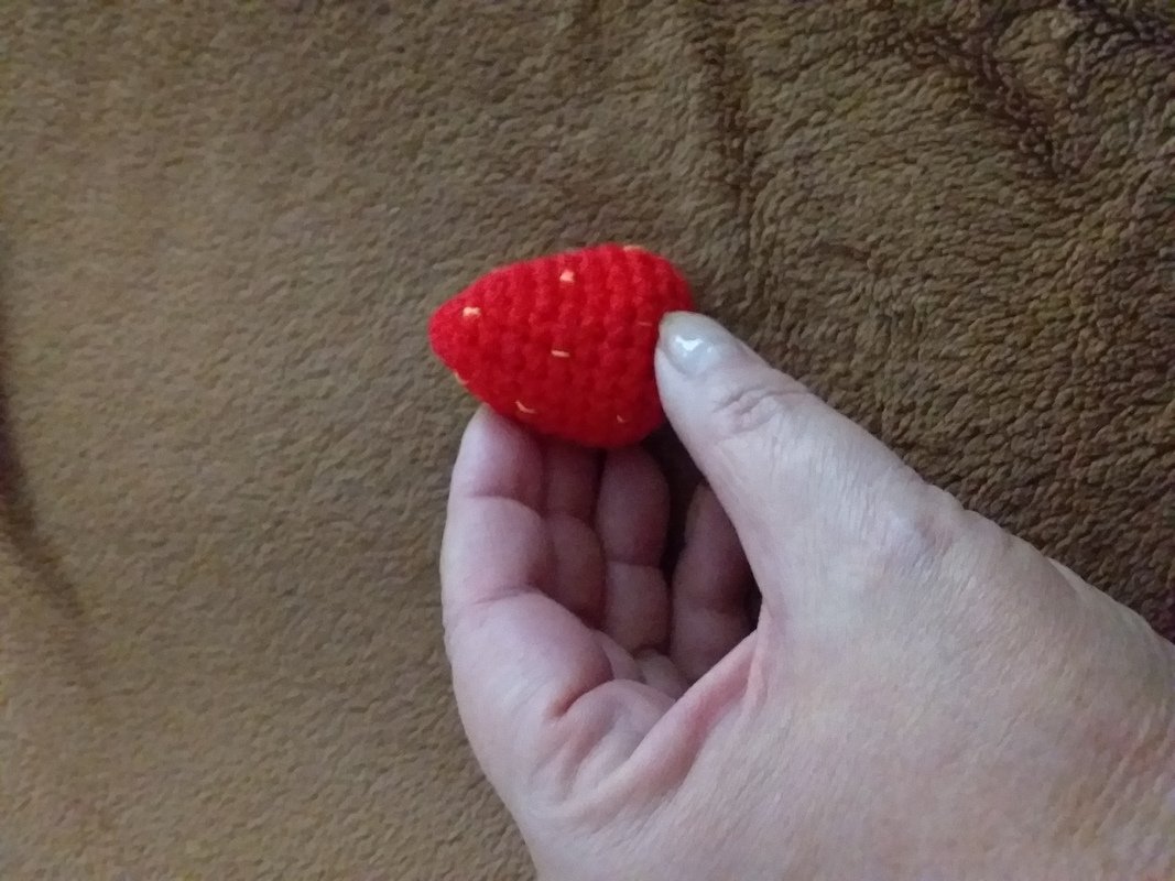 Benötigt werden die Farben braun, weiß, rot und Zwirn in gelb uns Füllwatte für die Erdbeeren.