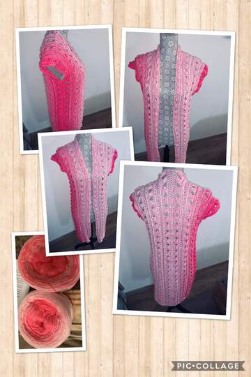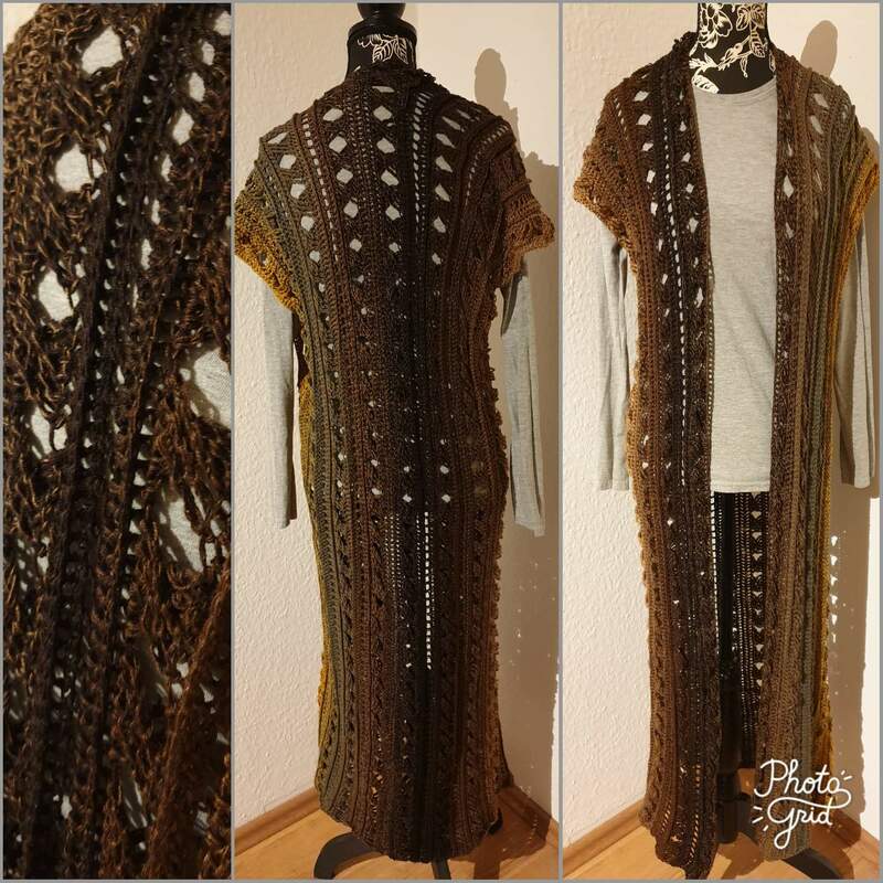 Ich habe für Konfektionsgröße 36 1500m Lauflänge eines 3fädigen Farbverlaufgarns benötigt. Meine Weste ist damit knielang geworden. Wenn ihr dieselbe Länge, wie ich, häkeln möchtet, dann benötigt ihr pro Konfektionsgröße größer oder kleiner ca. 200m mehr bzw. weniger Garn.