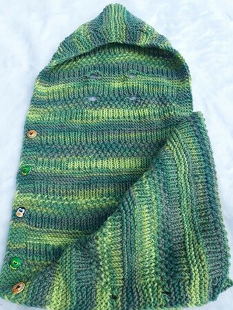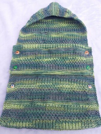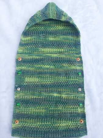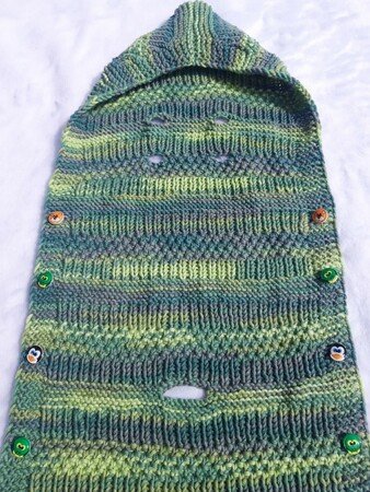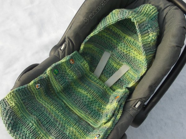 Er wird als großes Rechteck gestrickt. Einfache rechts-links-Muster wechseln sich immer wieder ab. An den Rändern werden Knopflöcher eingearbeitet. Dadurch kann die Größe individuell angepasst werden. Die Gurtschlitze habe ich so plaziert, dass der Schlafsack für Schalen mit einem Drei-Punkt-System verwendet werden kann.