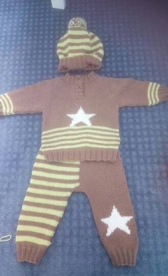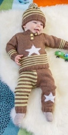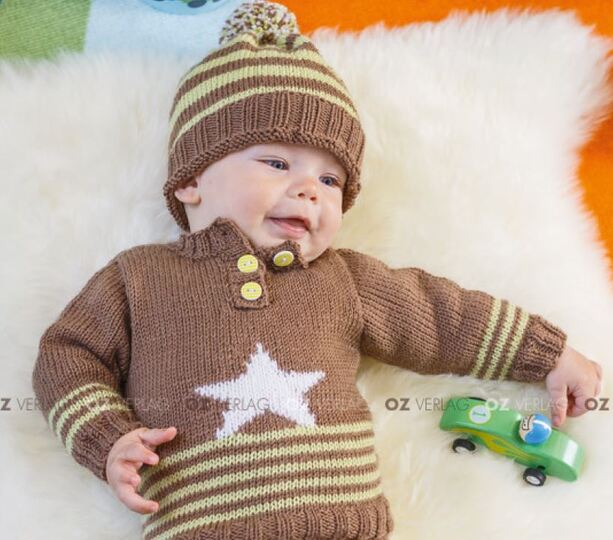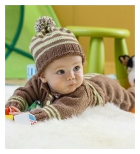 für die Hose 150 (200) 200 g Camel und 50 (50) 100 g Kiwi sowie 1 Rest Weiß; für das Mützchen je 50 g Camel und Kiwi sowie 1 Rest Weiß
