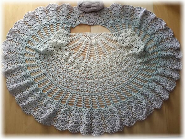 Es hat offene Muster und und ist so geschnitten das man es vorn mit einer Spange schließen kann und es trotzdem locker um die Schultern liegt.