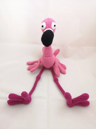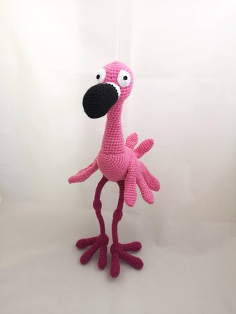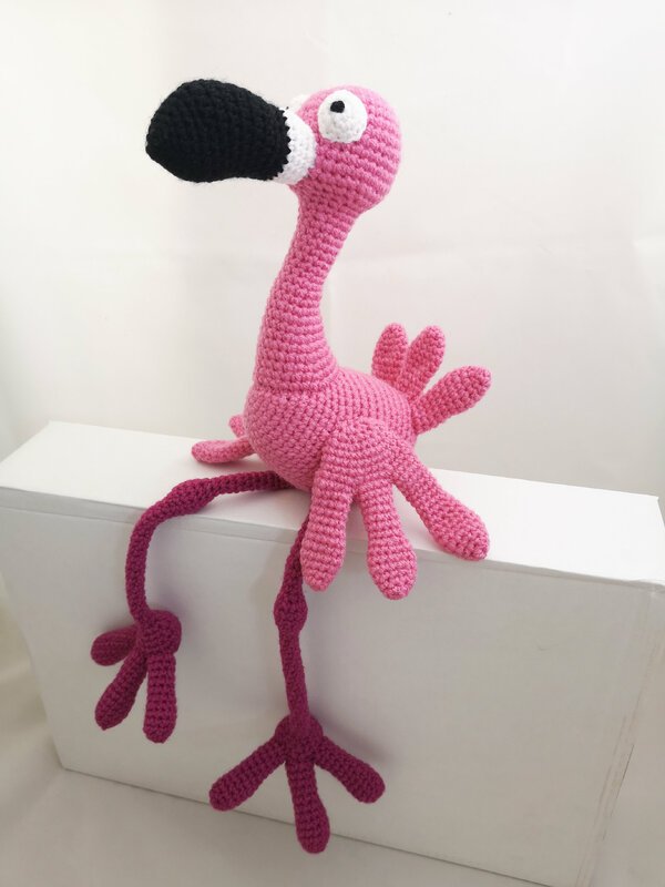 Der lustige Flamingo ist leicht zu häkeln und eignet sich perfekt als Deko und auch als Spielgefährte. Durch die langen Beine, kann man ihn perfekt als Dekofigur auf eine Regal- oder Schrankkante setzen. Wird er aus dünnerem Garn als hier angegeben gehäkelt, kann er zum Beispiel auch als Taschenbaumler verwendet werden oder ins Auto gehangen werden.