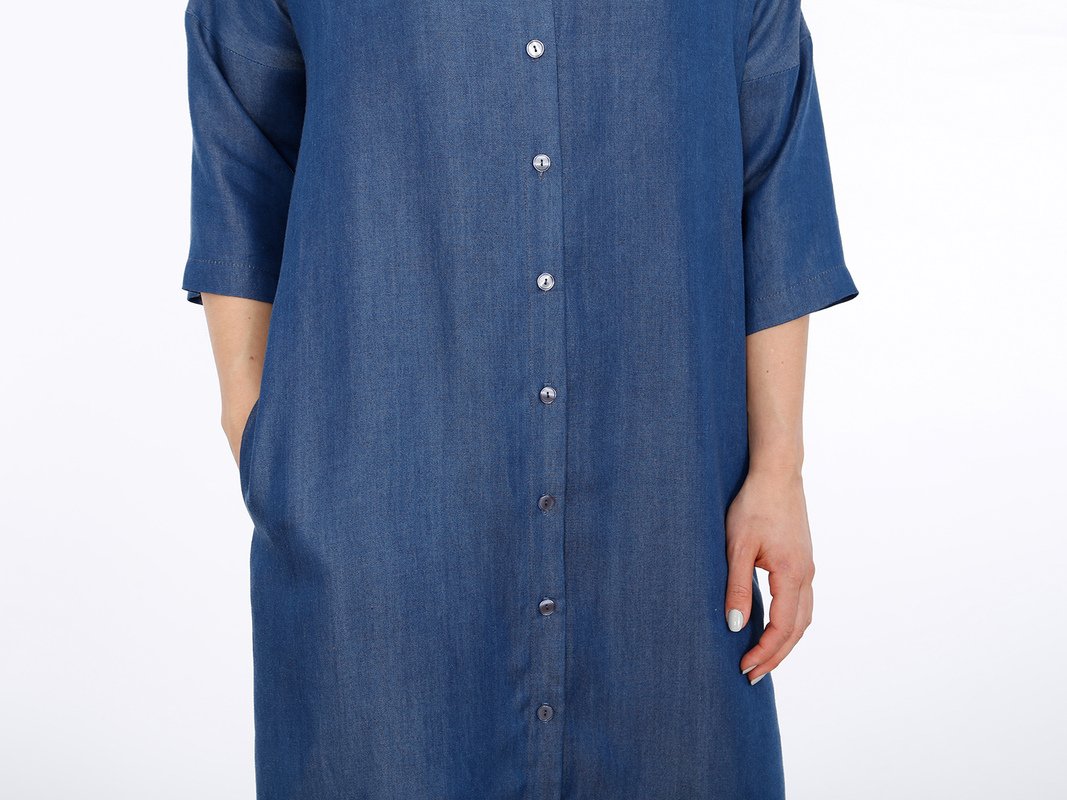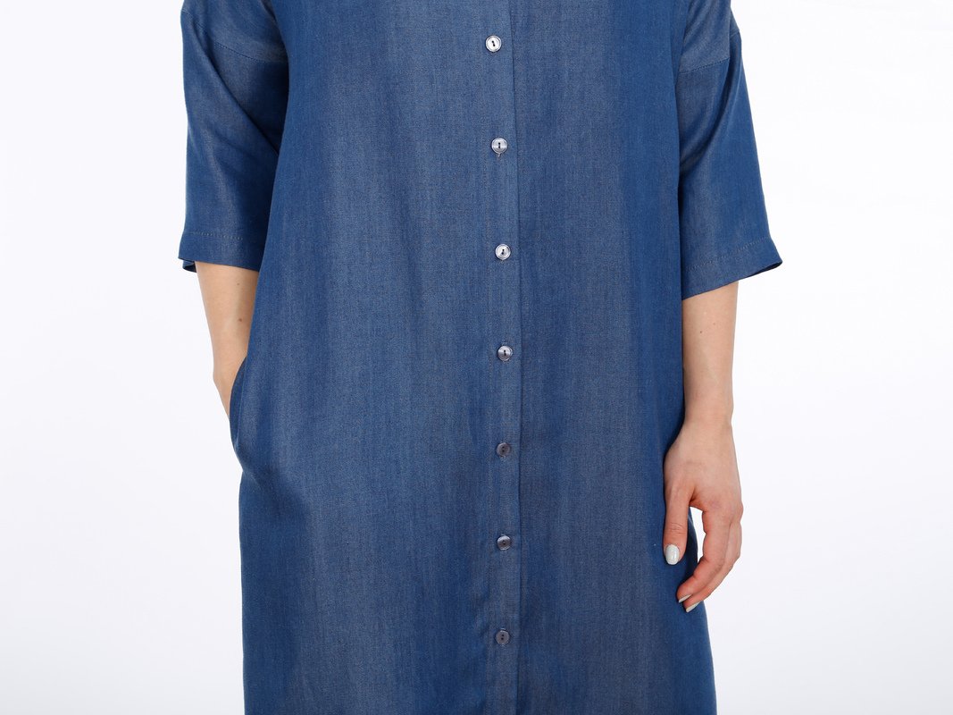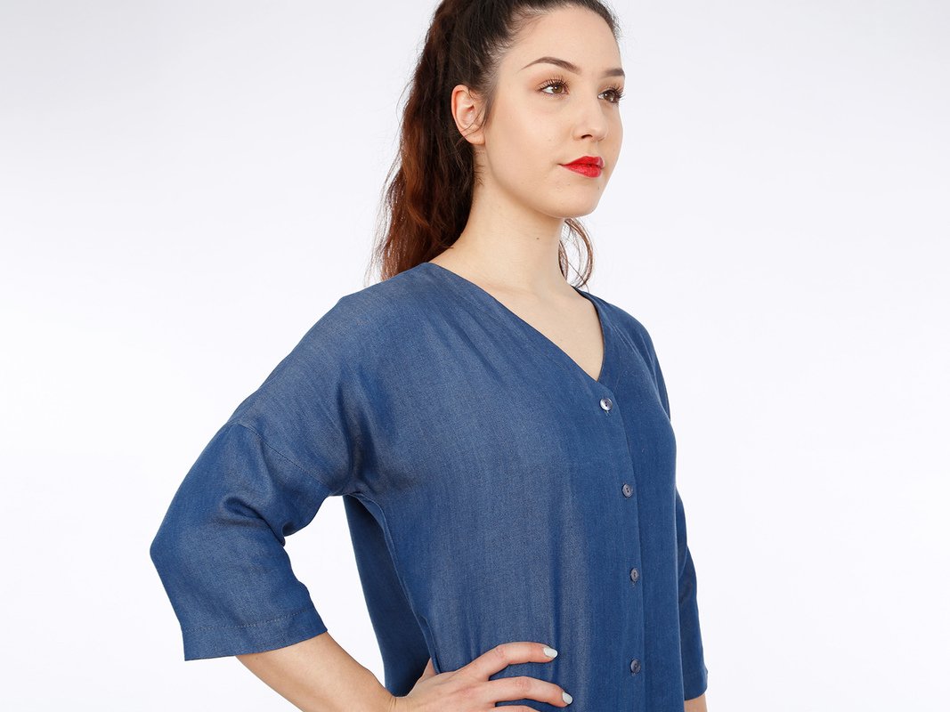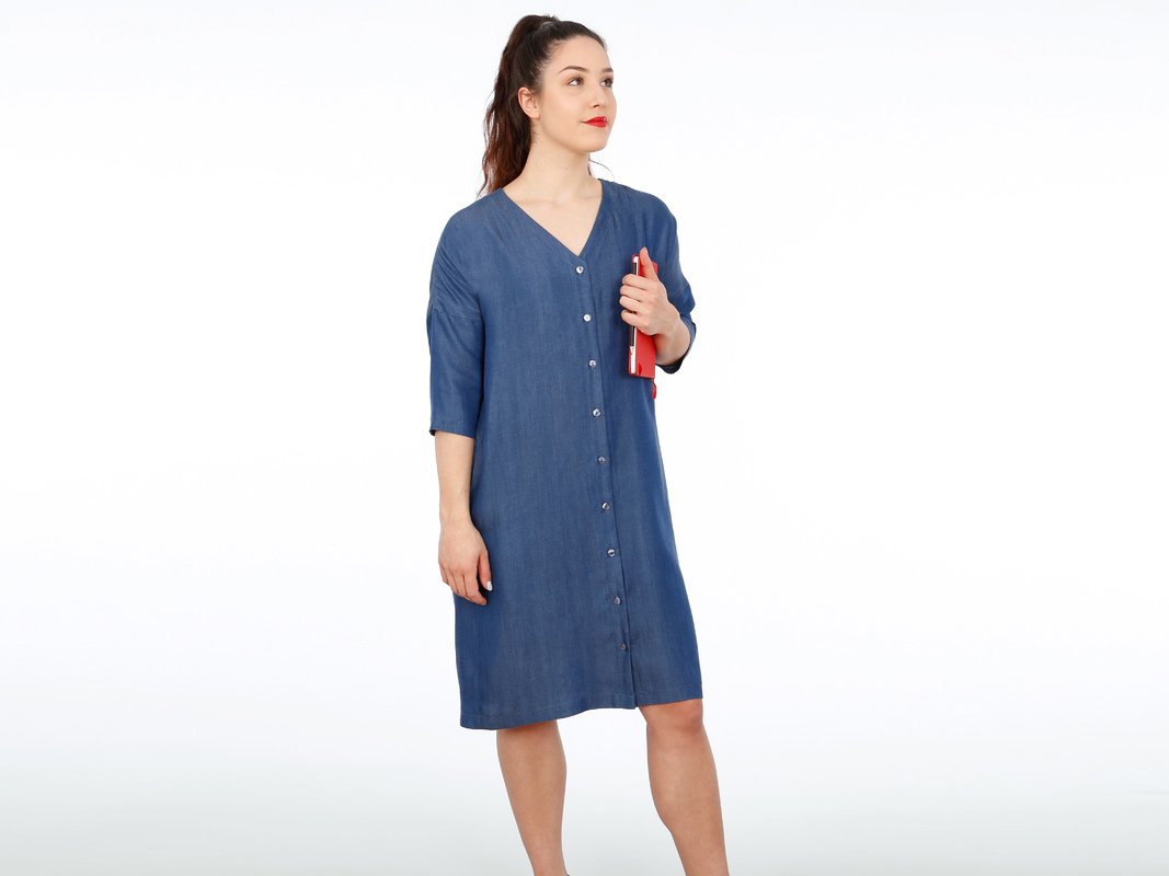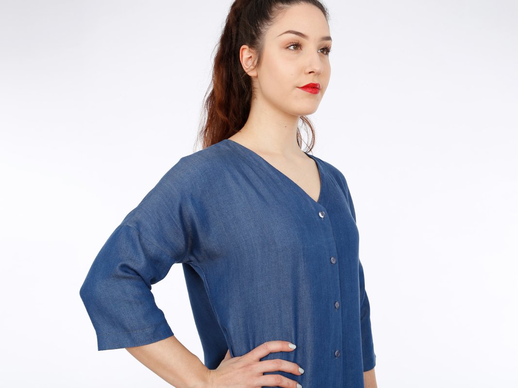 FRAU EDDA ist ein vielseitiges Blusenkleid, mit dem Du im Handumdrehen gut angezogen bist. Es ist gerade geschnitten, hat praktische Eingriffstaschen und einen V-Ausschnitt mit moderater Tiefe. Die durchgehende Knopfleiste entlang der Vorderseite und der V-Auschnitt sorgen in Kombination mit den Dreiviertelärmeln für einen luftigen und unbeschwerten Look. FRAU EDDA kannst Du mit oder ohne Gürtel tragen und die Optik immer wieder verändern.
