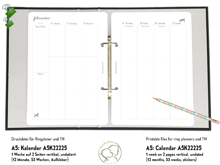 • keine gedruckten Lochmarken, daher für alle A5 Planer und Ringbücher verwendbar