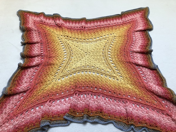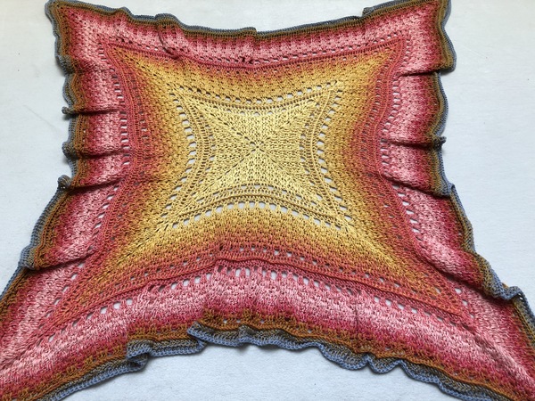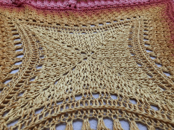 Die Decke Sonnenschein enthält ein schönes dichtes Muster, dass schnell gehäkelt ist. Durch das Muster werden die Ecken nach außen gezogen und die Decke erhält eine X-Form.
