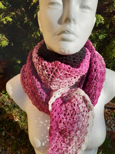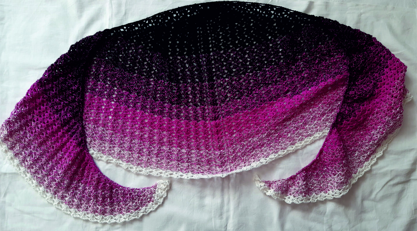 Das Tuch wird von unten (Spitze) nach oben gehäkelt. Ich habe hierfür einen Bobbel von 800m verwendet. Dabei ergibt sich eine Größe des Tuches von ca. 50m (Spitze zur Mitte) x 180cm (von Spitze zu Spitze)