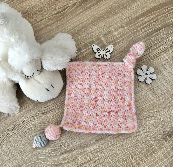 Mit einer Häkelnadel 4,00 mm und der Wolle von Schachenmayer Bravo Baby Smiles 185 wird das Knistertuch ca. 13x24 cm groß zzgl. des Knotens und der Kugeln.