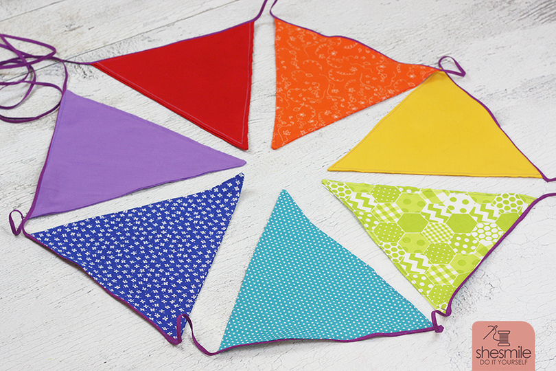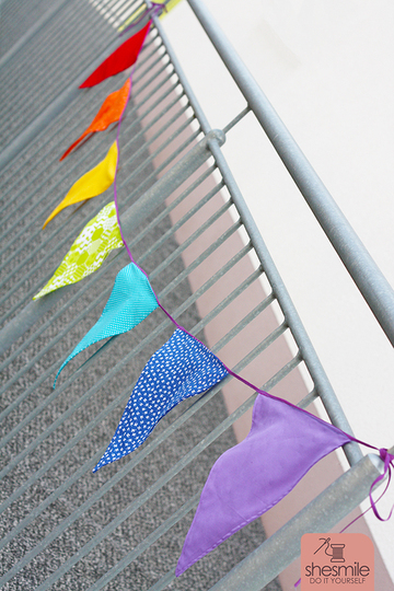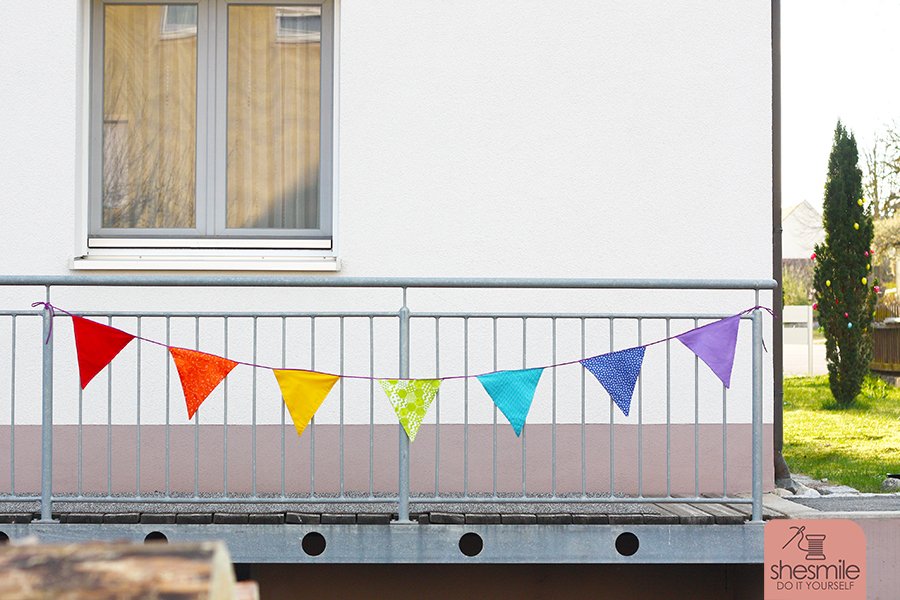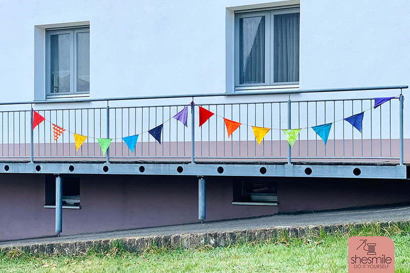 Nähanleitung und Schnittmuster gestaltet als PDF-E-Book für eine Wimpelkette in Regenbogenfarben. Zum Aufhängen am Balkon, Treppengeländer, Zaun oder als Kinderzimmer- und Geburtstags-Deko.