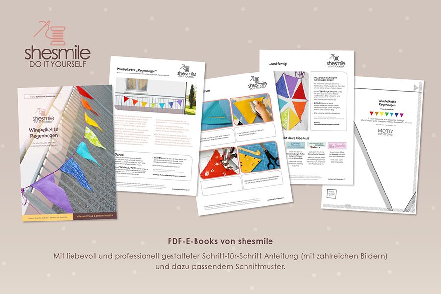 PDF-E-Books von shesmile: Diese leicht verständliche Schritt-für-Schritt-Anleitung mit vielen Fotos ist auch für Nähanfänger und Kinder geeignet, denn die sehr ausführliche Fotoanleitung begleitet dich bei jedem Schritt.