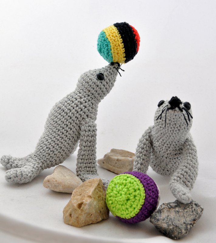 Die Giraffe ist ca 16 cm hoch und der Seelöwe von Schnauze bis Rückenflossenspitze ca 13 cm