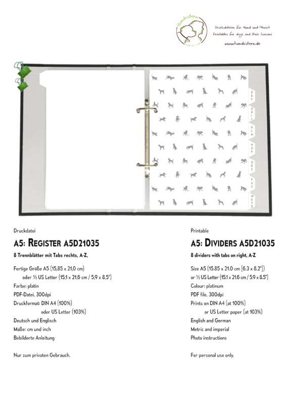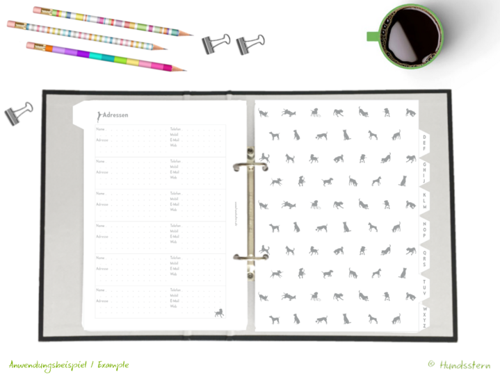 Die passende Druckdatei für die Adressbuchseiten gibt es hier https://www.crazypatterns.net/de/items/61119/adressbuch-einlagen-fuer-planer-a5-hunde-a5a2105