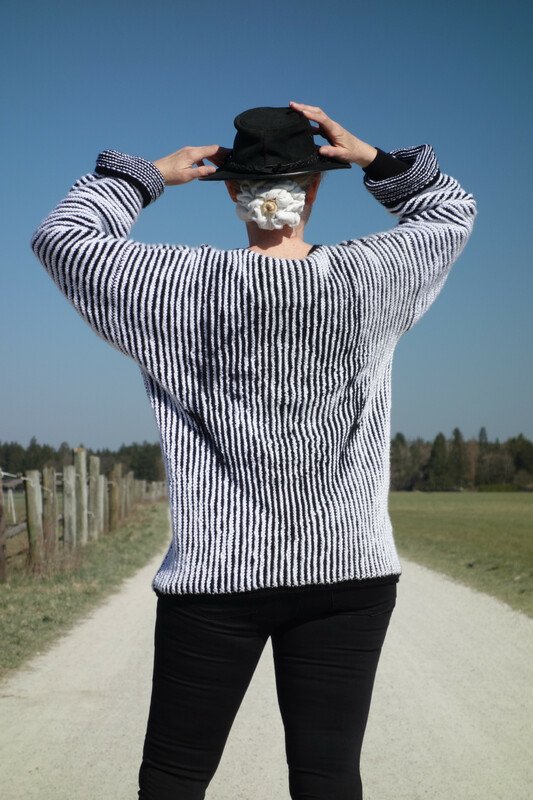 Da jede unterschiedlich fest oder locker strickt, empfehle ich eine Probe, um zu sehen, ob das Motiv bei Draufsicht unsichtbar wird und bei Schrägsicht deutlich genug erscheint.