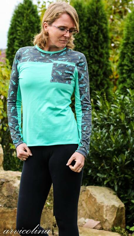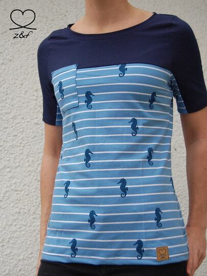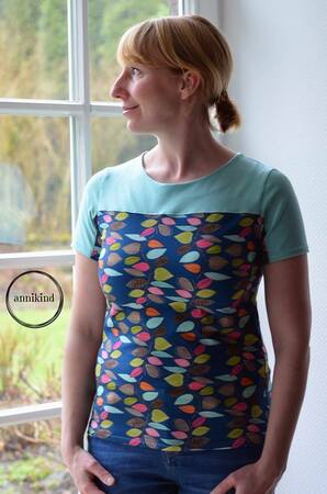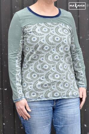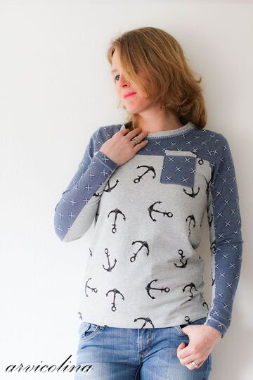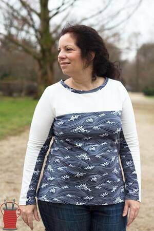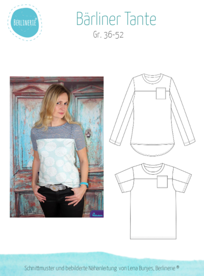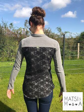 Mit diesem E-Book kannst du dir ein Basic-Shirt nähen, das größengerecht sitzt und eine besondere Teilung aufweist: Die Teilung des Brustbereiches scheint sich vom Rest des Shirtes abzuheben und läuft am Ärmel weiter. Eine Brusttasche sitzt in der Herzgegend und kann wunderbar die Farbe der unteren Teilung mit nach oben „holen“- gerade wenn du das Schnittmuster zum Colourblocking nutzt. Das Shirt lädt auch ein, passende Kombistoffe miteinander optimal zur Geltung zu bringen. Das Shirt ist tailliert und hat einen Vokuhila-Saum. Hinten fällt dieser weiter und in abgerundeter Form über den Pobereich. Du kannst das Shirt natürlich auch ohne Vokuhila nähen. Es stehen dir ein Kurz- und Langarm zur Verfügung.