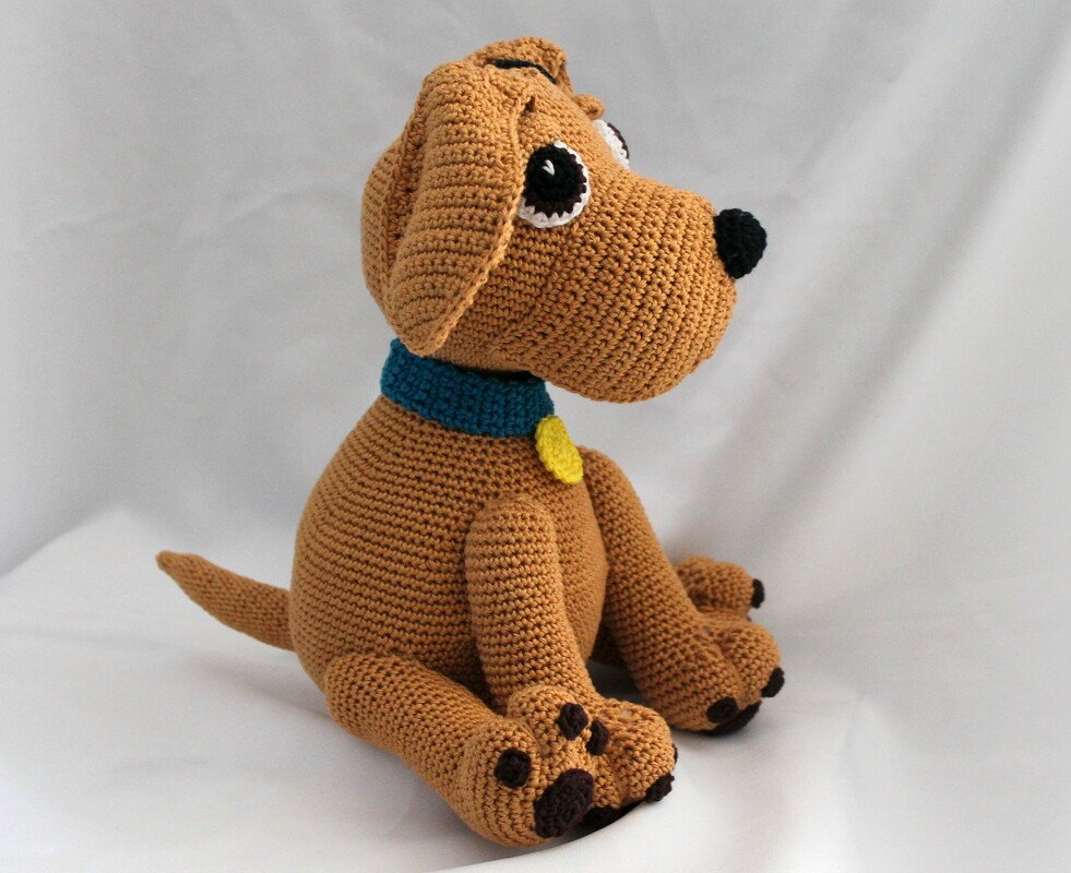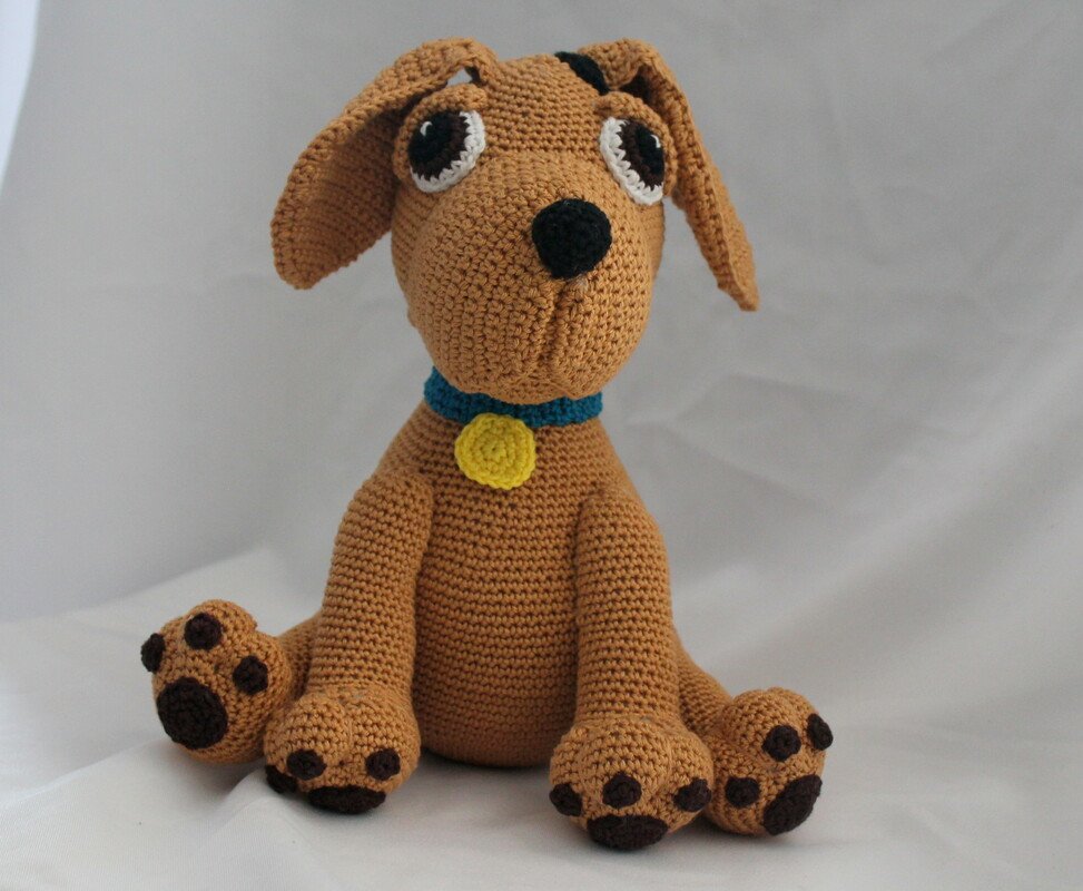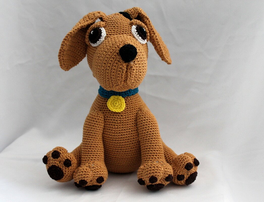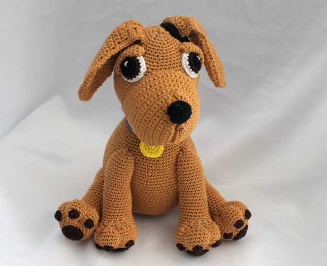 Der fertig gehäkelte Hund wird ca 30 cm groß.