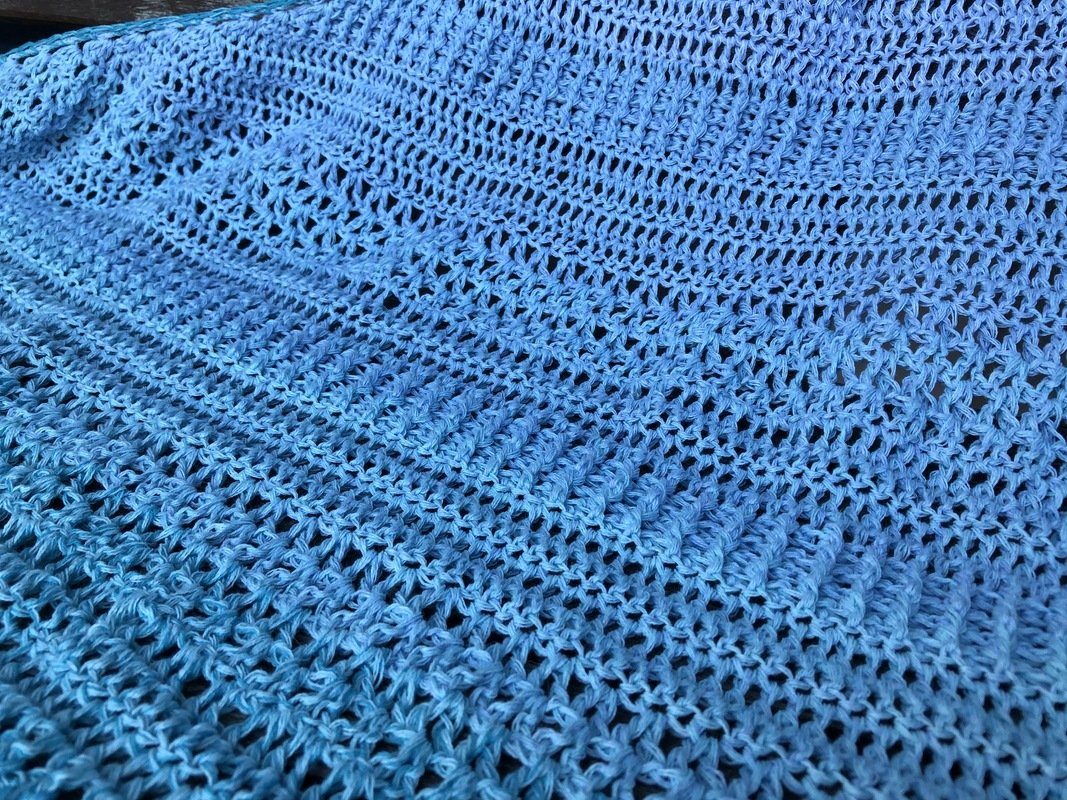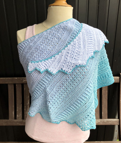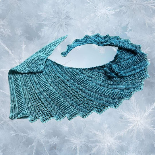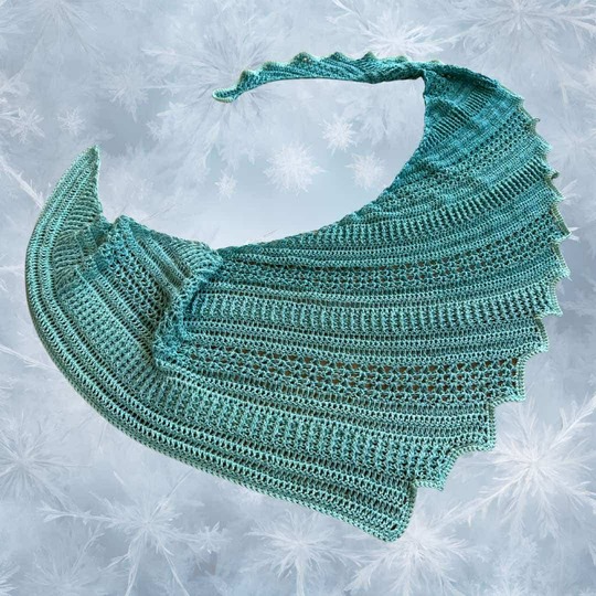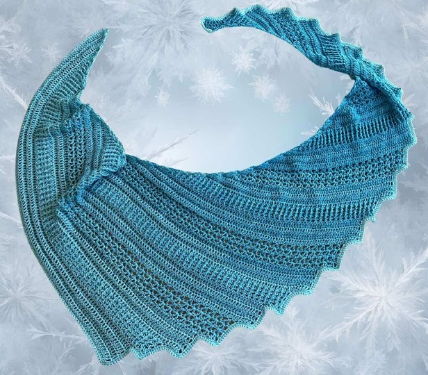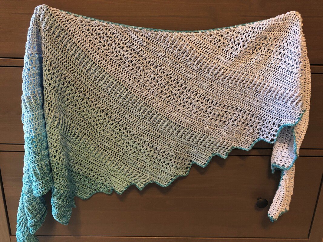 Mein Beispieltuch hat eine Spannweite von 1,65m erreicht. Die tiefste Stelle misst 0,42m. Gearbeitet wurde der Drachenschwanz mit einem 4-fädigen Bobbel mit 750m und NS 4,5.