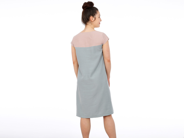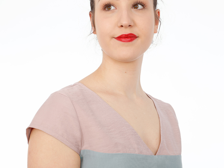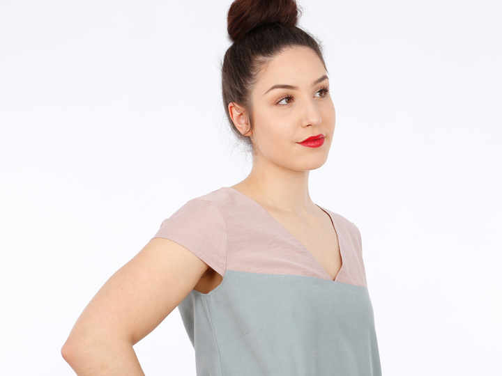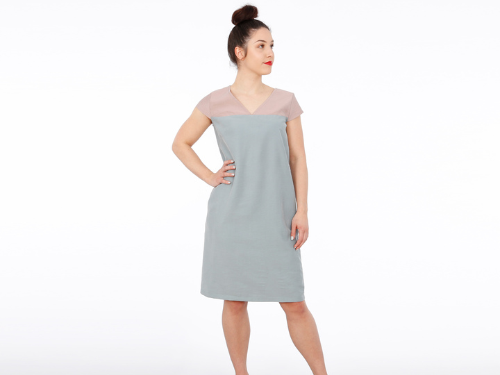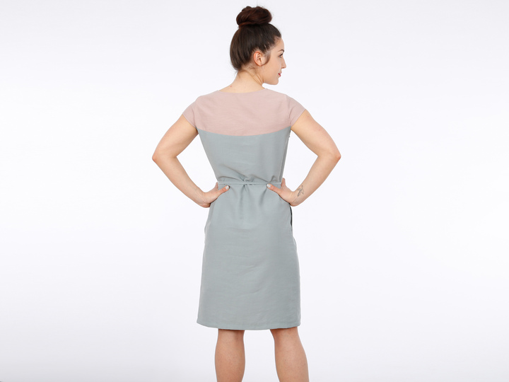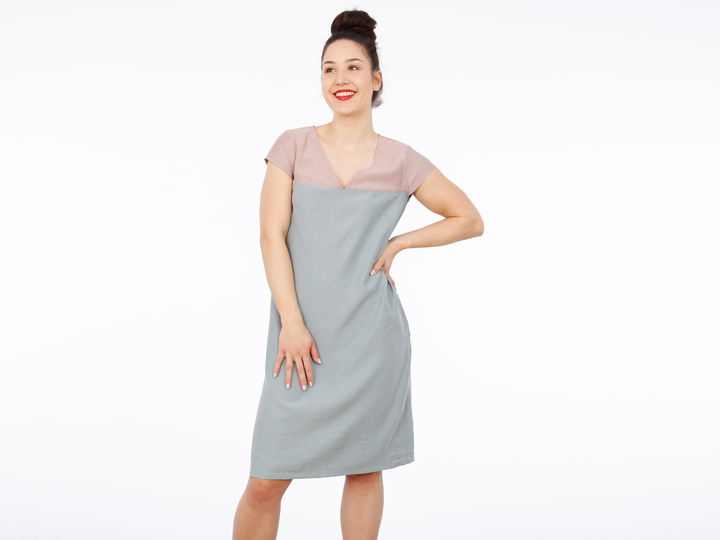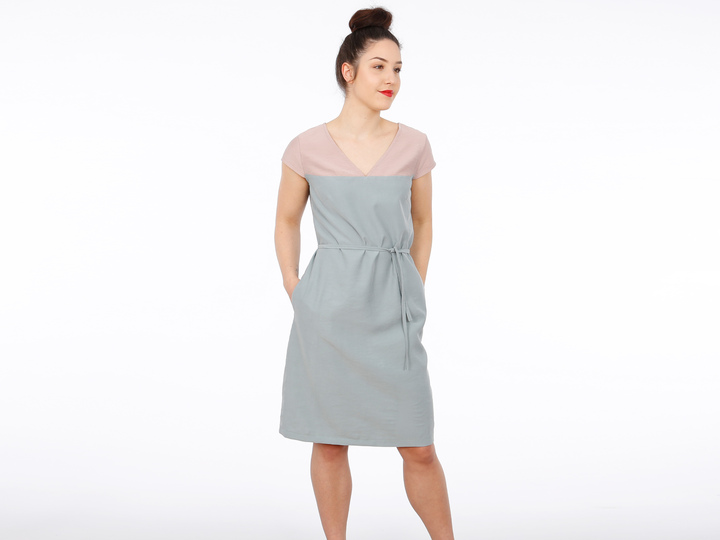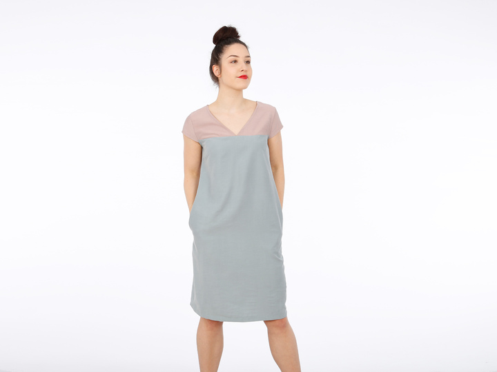 Mit FRAU ALVA zieht ein Kleid bei Dir ein, dass klare Linien mag. Eine durchgehende Passe unterteilt das Vorder- und Rückenteil. So kannst Du Muster oder Farben kombinieren oder durch Paspeln oder Steppnähte kleine Akzente setzen. Der V-Ausschnitt endet genau an der Teilungsnaht und die Ärmel liegen optisch auf gleicher Höhe. Brustabnäher unterhalb der Passenabtrennung sorgen für einen guten Sitz und Seiteneingrifftaschen für zusätzlichen Komfort. Wer mag, näht sich ein passendes Bändchen oder auch einen breiten Gürtel und kann FRAU ALVA mal leger und mal auf Figur tragen, je nach Lust und Laune.