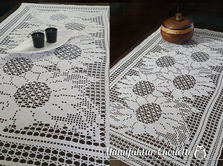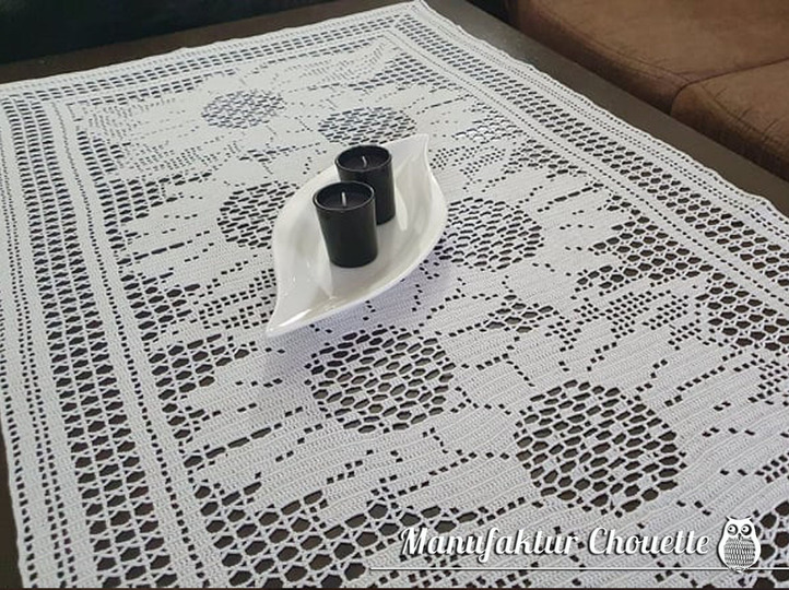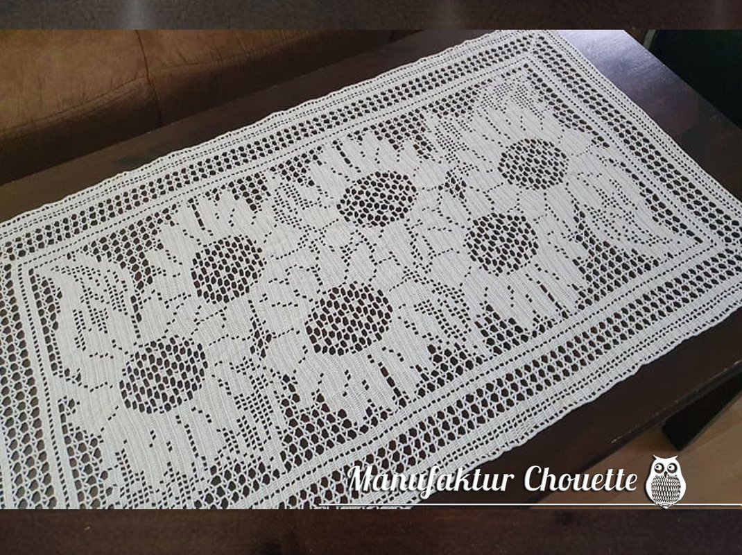 Sonnenblumen gehören zum Sommer. Deshalb sind sie das Hauptmotiv meiner Sommerkollektion. Dieser Läufer erinnert an ein Sonneblumenfeld im Sommer. Er schmückt nicht nur den Stubentisch, auch auf dem Garten- oder Balkontisch ist er schön anzusehen (probiere mal gelbes Garn).