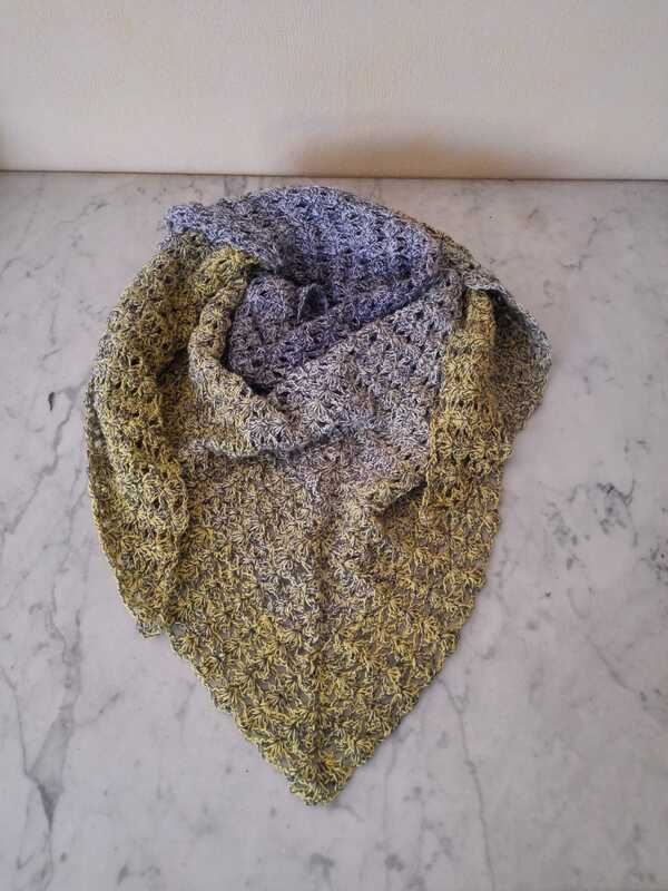 Die Häkelanleitung für das Dreieckstuch Raudor hat ein Muster, das ohne vertieften Kenntnisse mit gängigen Maschen auskommt und doch eine schöne Wirkung erzielt.
